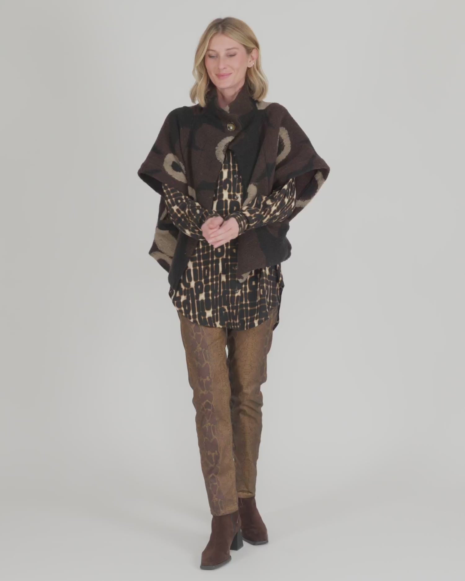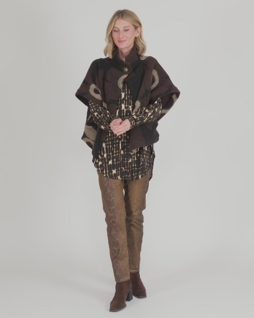 This cozy cropped jacket wraps you in softness with an oversized shape and brushed texture. Wide sleeves and a foldover collar lend effortless drape, while a single button closure and side slits offer balance and movement. A standout layering piece in a sculptural floral palette.