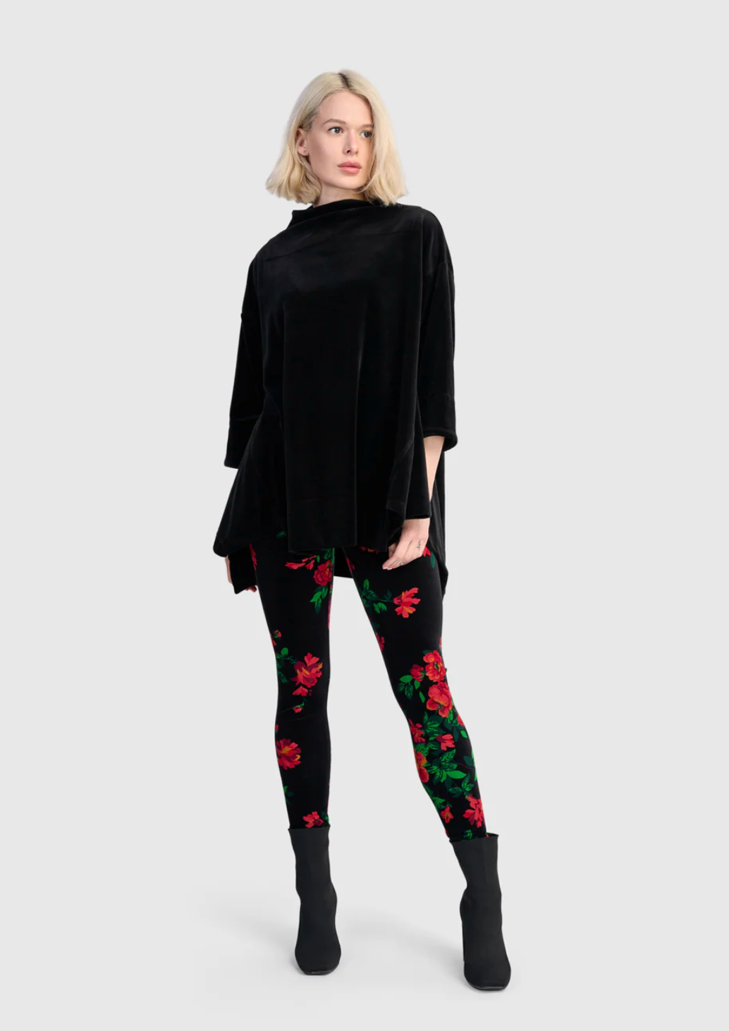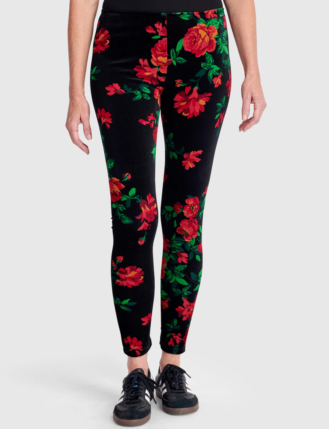 These luxe velvet leggings are slim and fitted for a flattering silhouette that moves with you. Crafted from plush stretch velvet with a full-length cut, they offer both polish and comfort. A flat, elastic waistband ensures a smooth fit, ideal for layering under tunics or pairing with oversized knits.