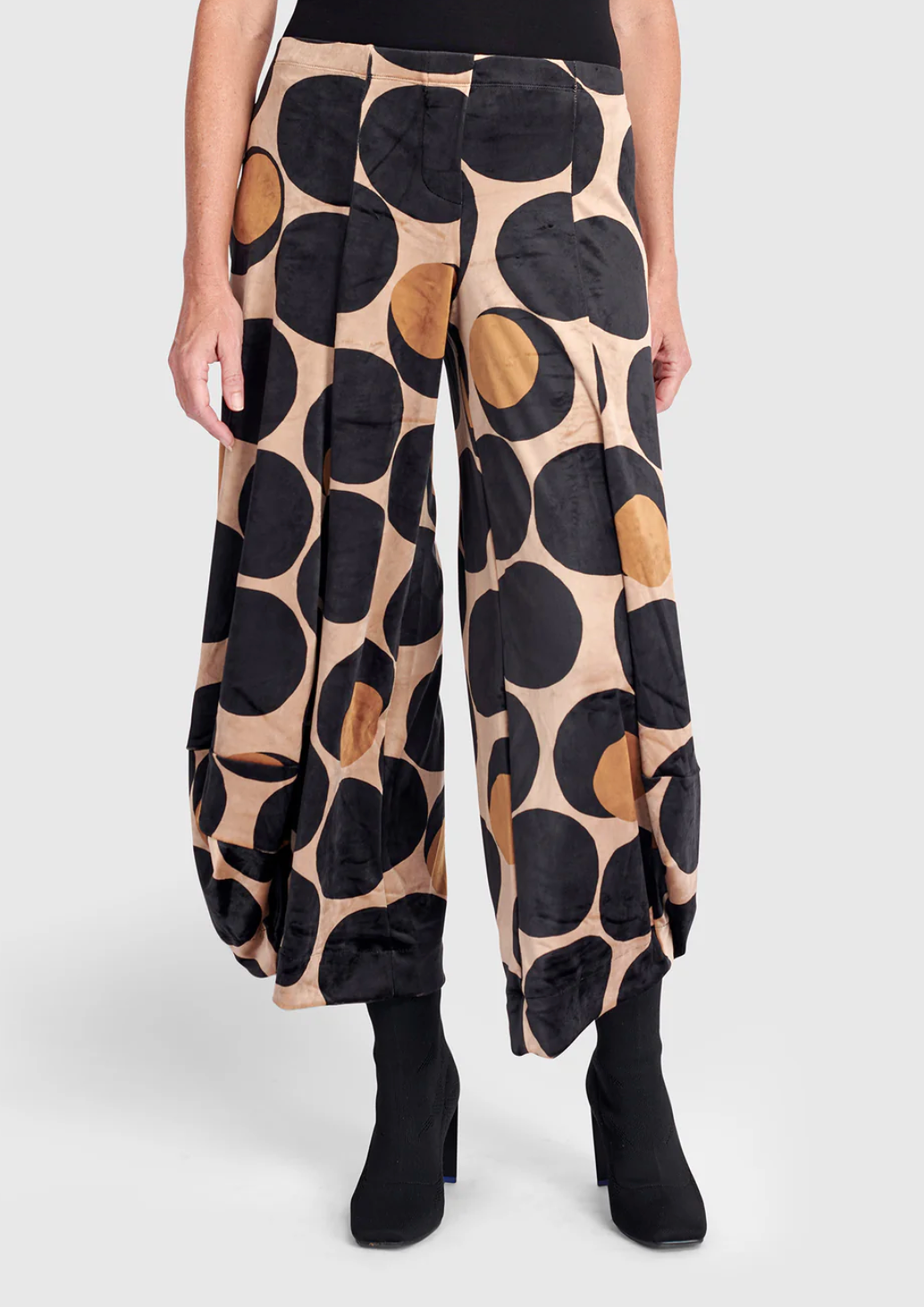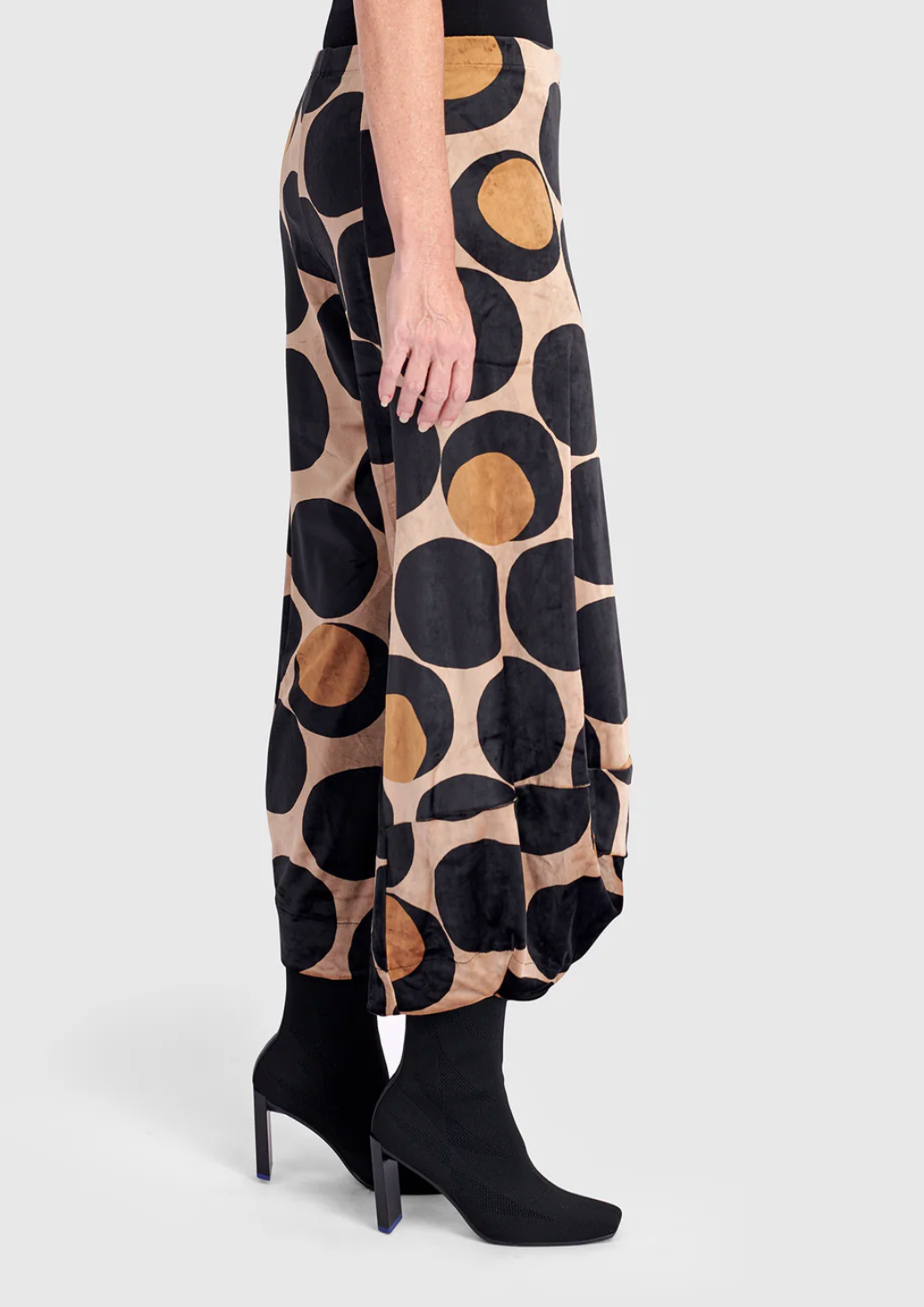 A fresh take on Alembika's beloved Punto silhouette, now rendered in sumptuous stretch velvet. These high-rise lantern pants taper into a pouf hem that grazes the ankle, offering sculptural flair with a soft hand. A wide elastic waistband and mock fly add effortless pull-on comfort. An elegant alternative to denim or basic trousers, perfect for dressing up or down.