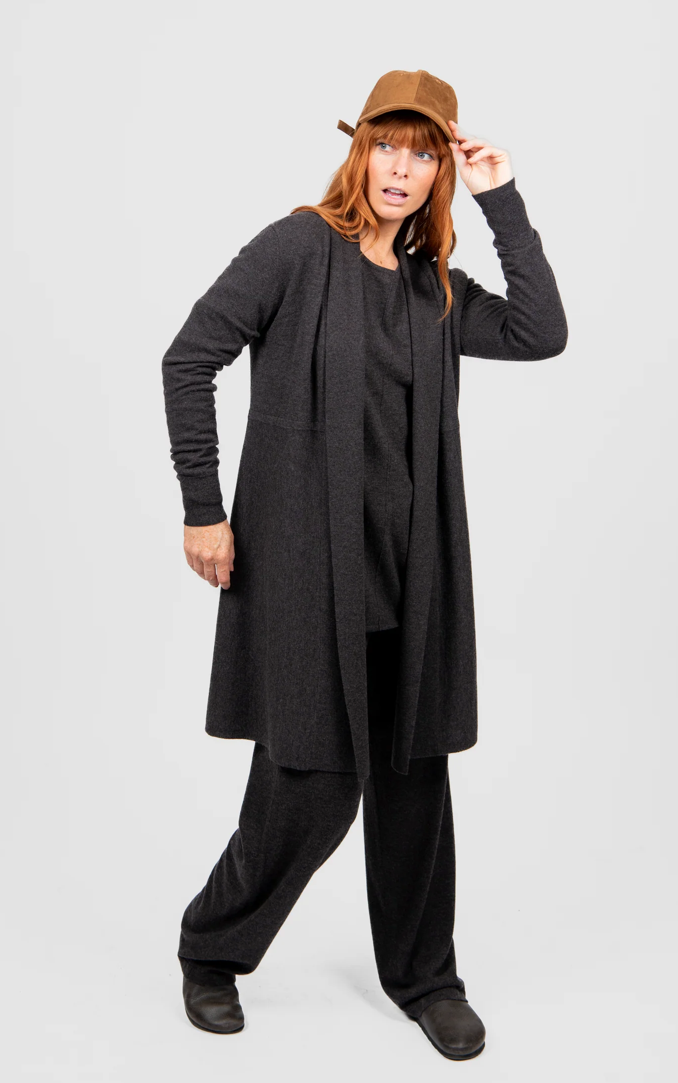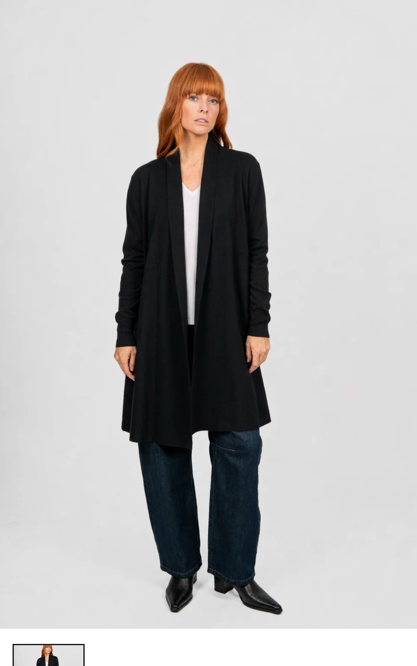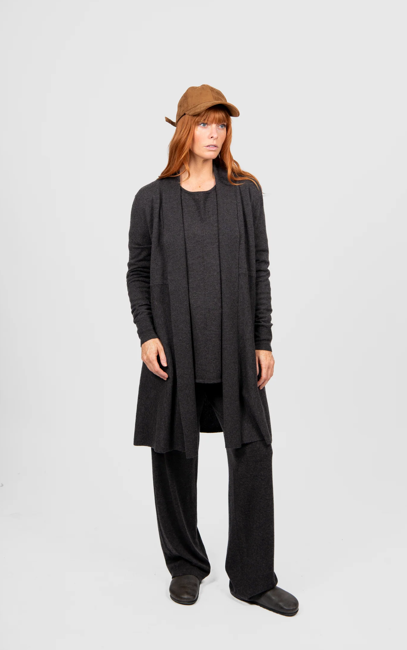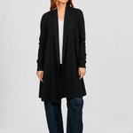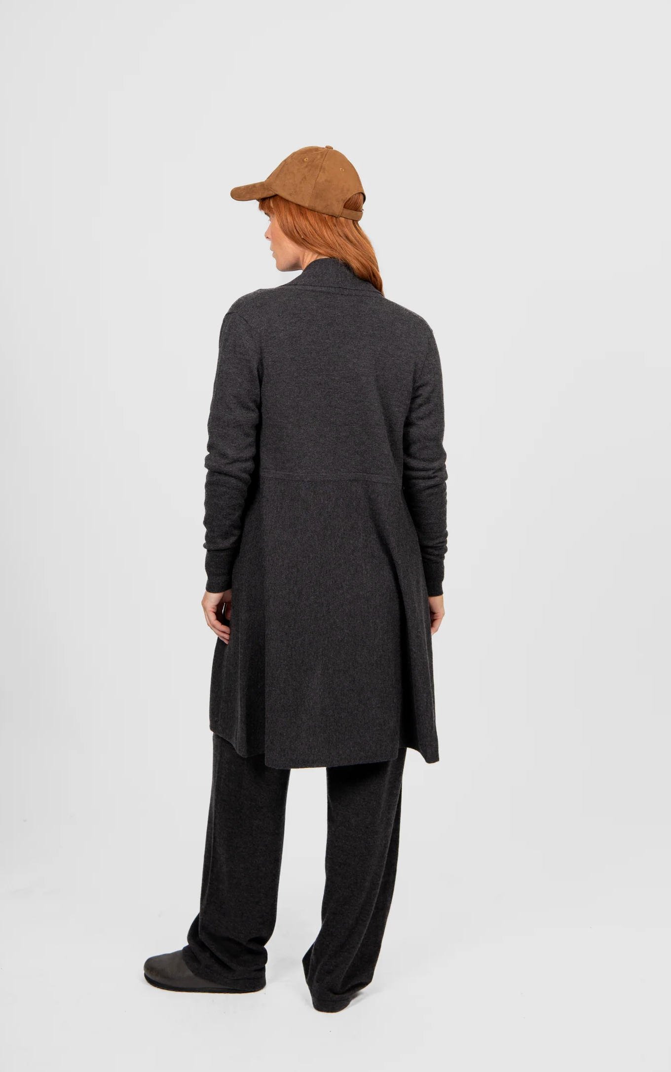 Longline elegant open-front cardigan with a floaty silhouette that falls gracefully on the body from the waist. The gently curved lower cardigan creates a flowing effect through to the hem. Made from our signature merino cashmere, it is ideal for snuggling into when you feel a chill in the air, or you can wear it open with a simple cami or tee. With its sleek silhouette, this cardigan adds a touch of sophistication to any outfit.