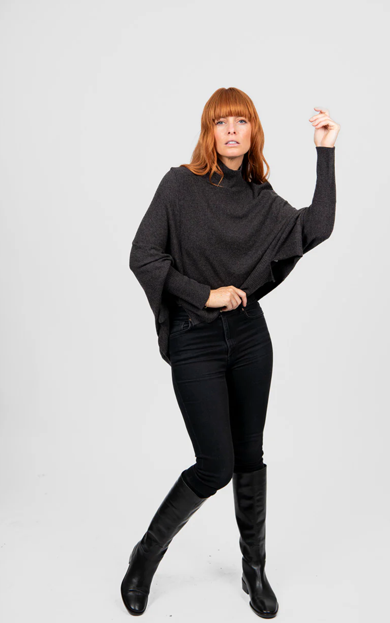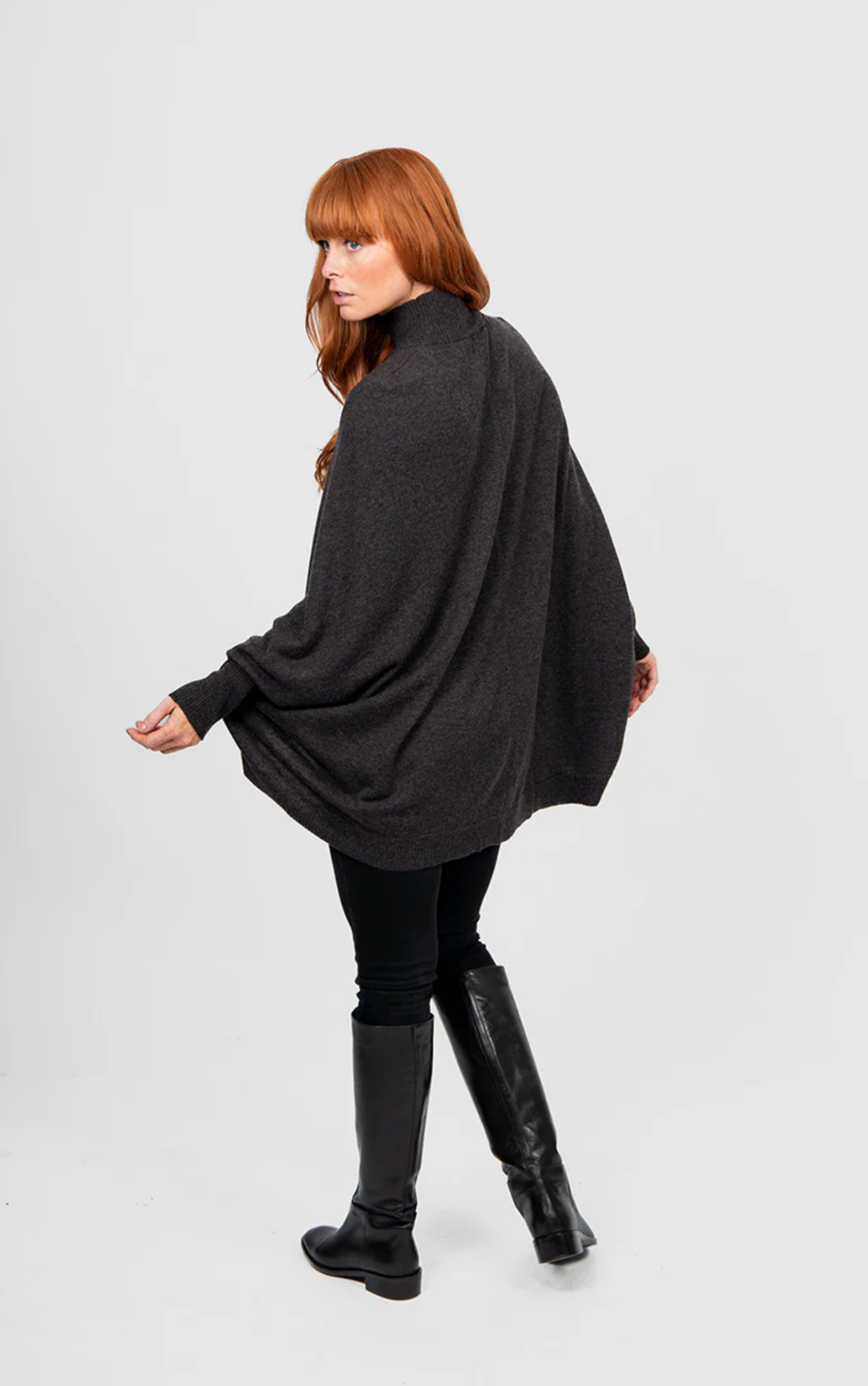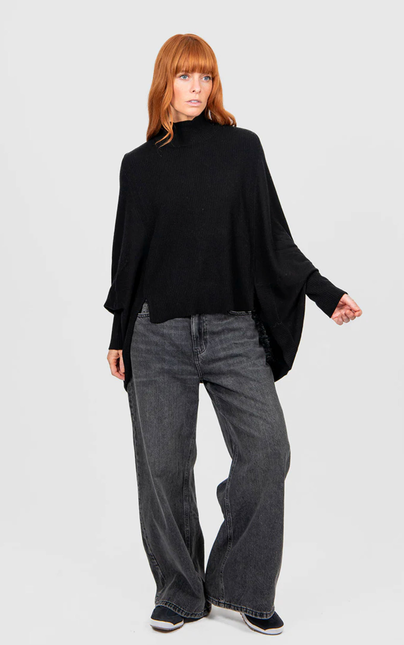 - A modern poncho shape featuring a generous cut and dolman-style sleeves, offering a relaxed drape that prioritises comfort without sacrificing style.