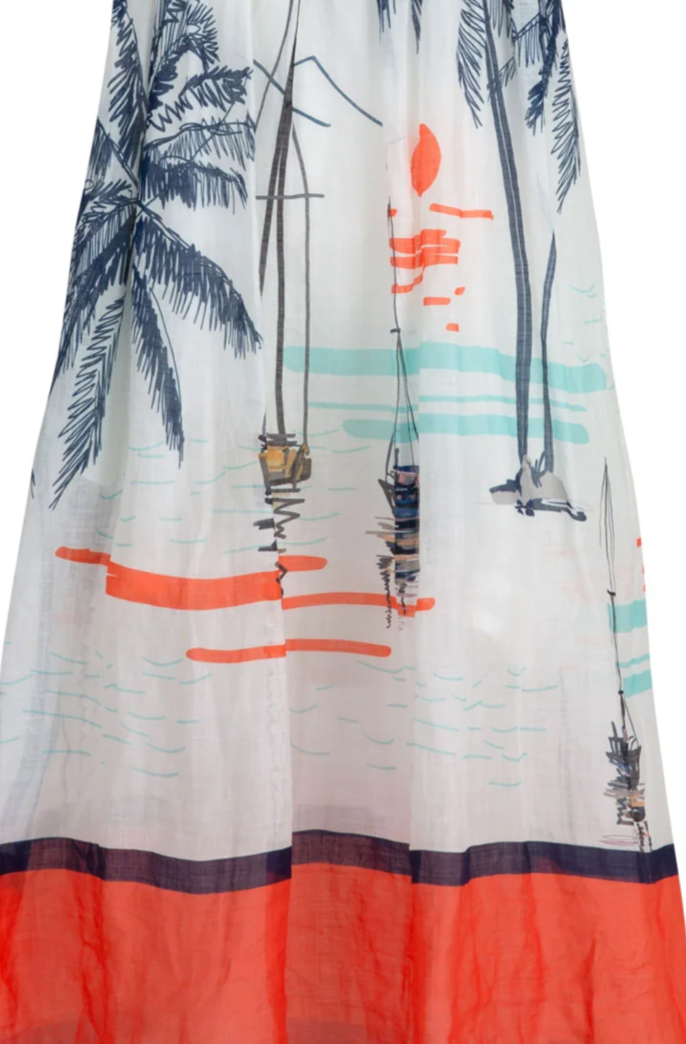 Full and fabulous the ‘She’s Oar-spiring’ skirt grants whimsical style through its gauzy fabrication. Crafted in the cotton, ramie blend ‘Float Your Boat’ fabric, this skirt sports a strong nautical theme with whites and blues contrasted with a bold orange pop. Fullness granted by gathers makes this floaty skirt a breeze to wear this summer.