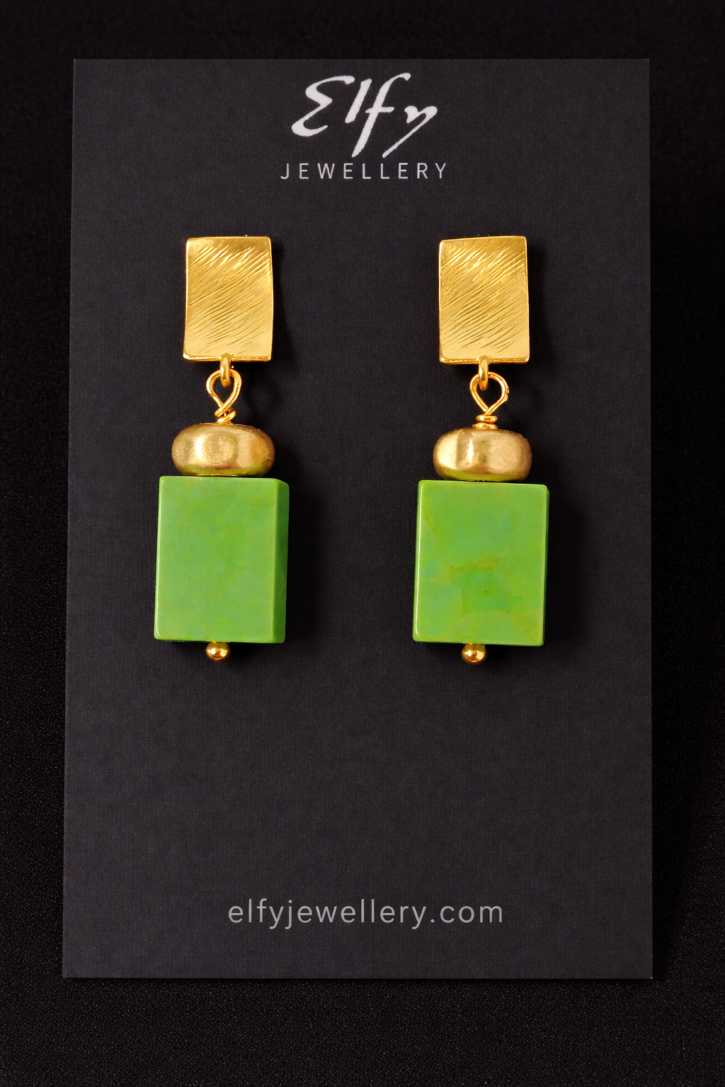 These stunning earrings feature authentic Navajo turquoise in a vibrant green hue, expertly set between gold-plated accents. Designed and handcrafted in Australia, each pair showcases the natural beauty of the stone with a sophisticated matte finish. The combination of rich turquoise and warm gold tones creates an elegant, timeless piece perfect for adding a touch of bohemian sophistication to any look.