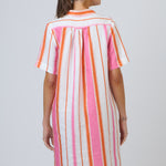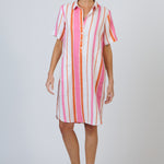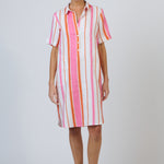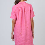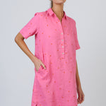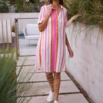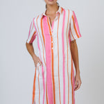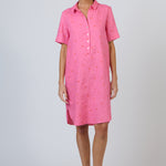 A lively interplay of colour and form, our signature shirt dress makes a striking statement. Crafted from super soft, laundered linen, it features short sleeves, a partial button-through front, and practical side pockets. The relaxed silhouette falls with a gently curved hem and side slits for natural movement. Finished with the label’s signature stitch detailing, it’s a refreshing blend of modern ease and timeless appeal.