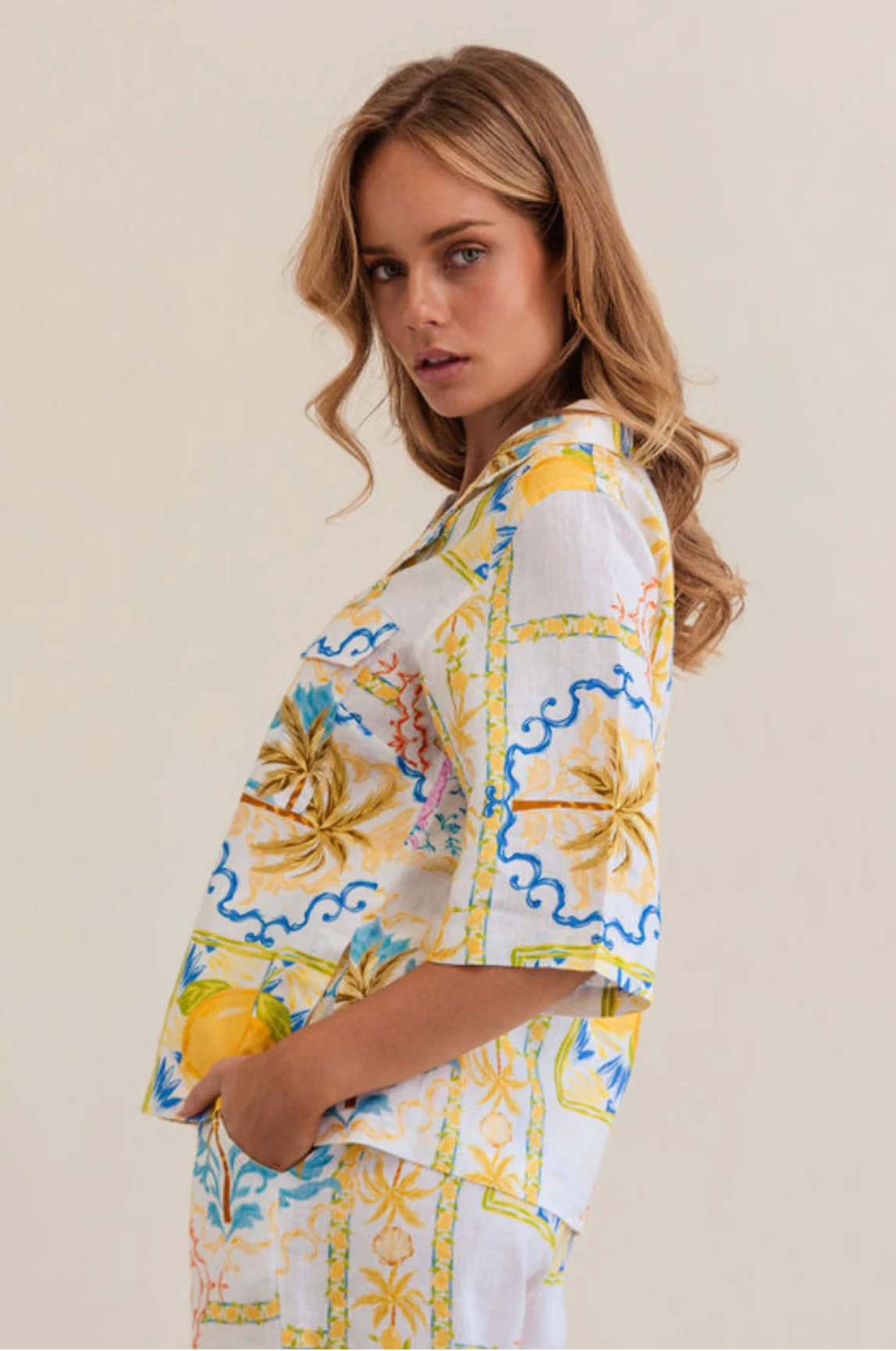 Designed for effortless style and comfort, the Linen Safari Shirt by Australian Label Kaleido, showcases a striking tropical vacation inspired print in vibrant summer colours. With a classic button-down front, collar, and 2 front patch pockets, this gorgeous safari style shirt blends structure with a relaxed linen feel.