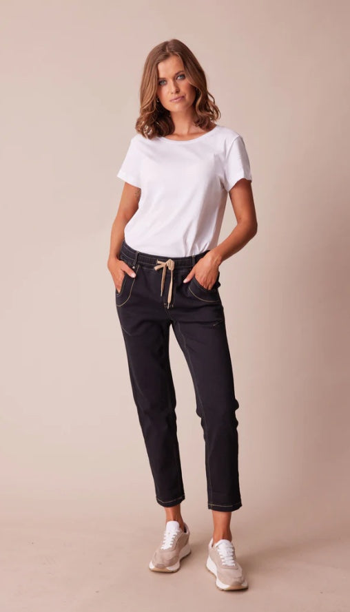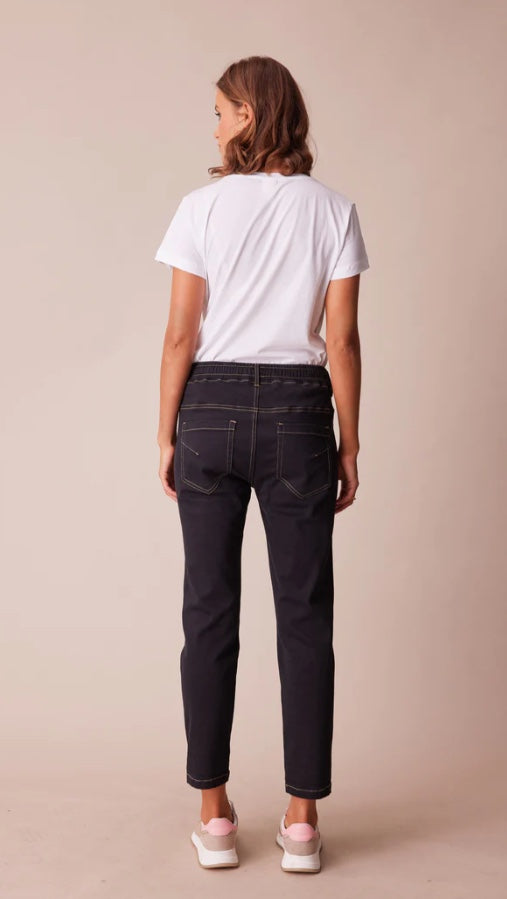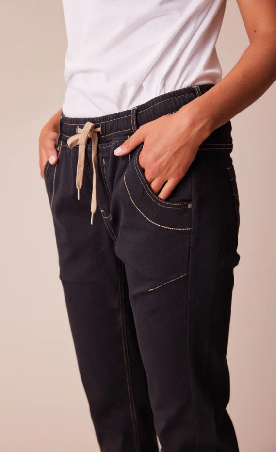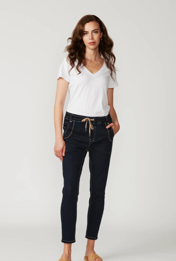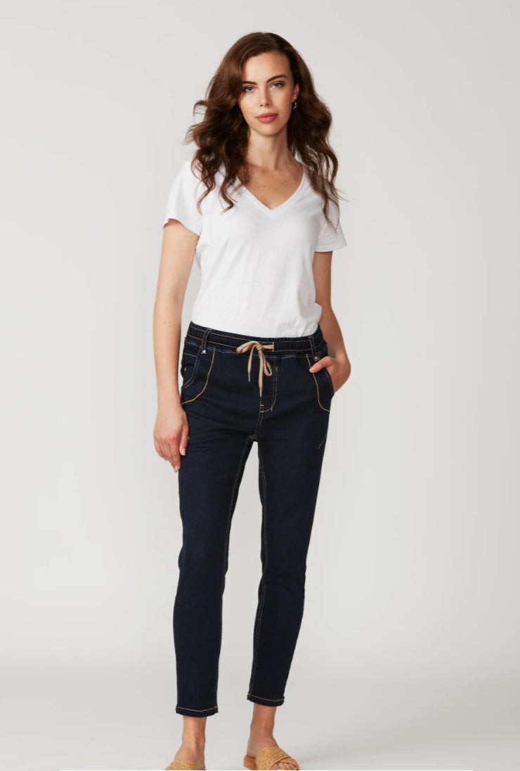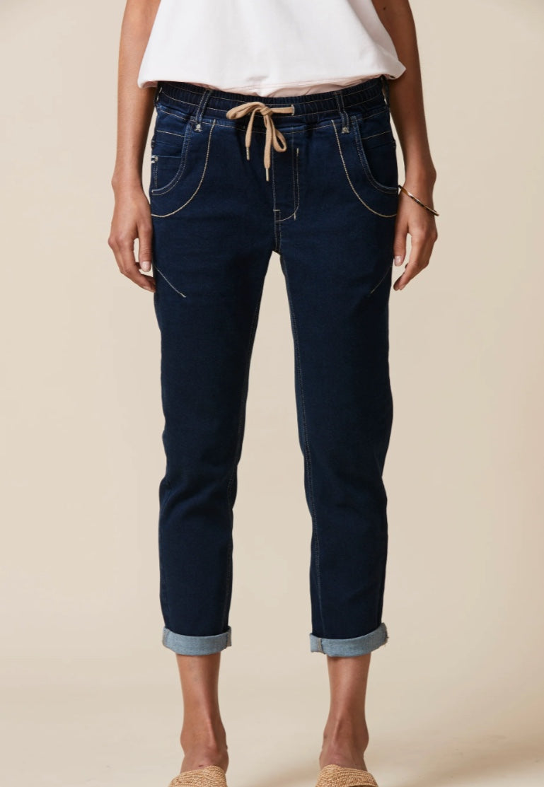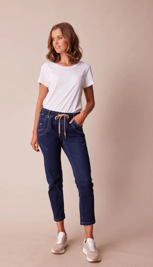 Casual jean with elasticated waist and adjustable drawstring tie. Soft handle achieved by special garment wash.