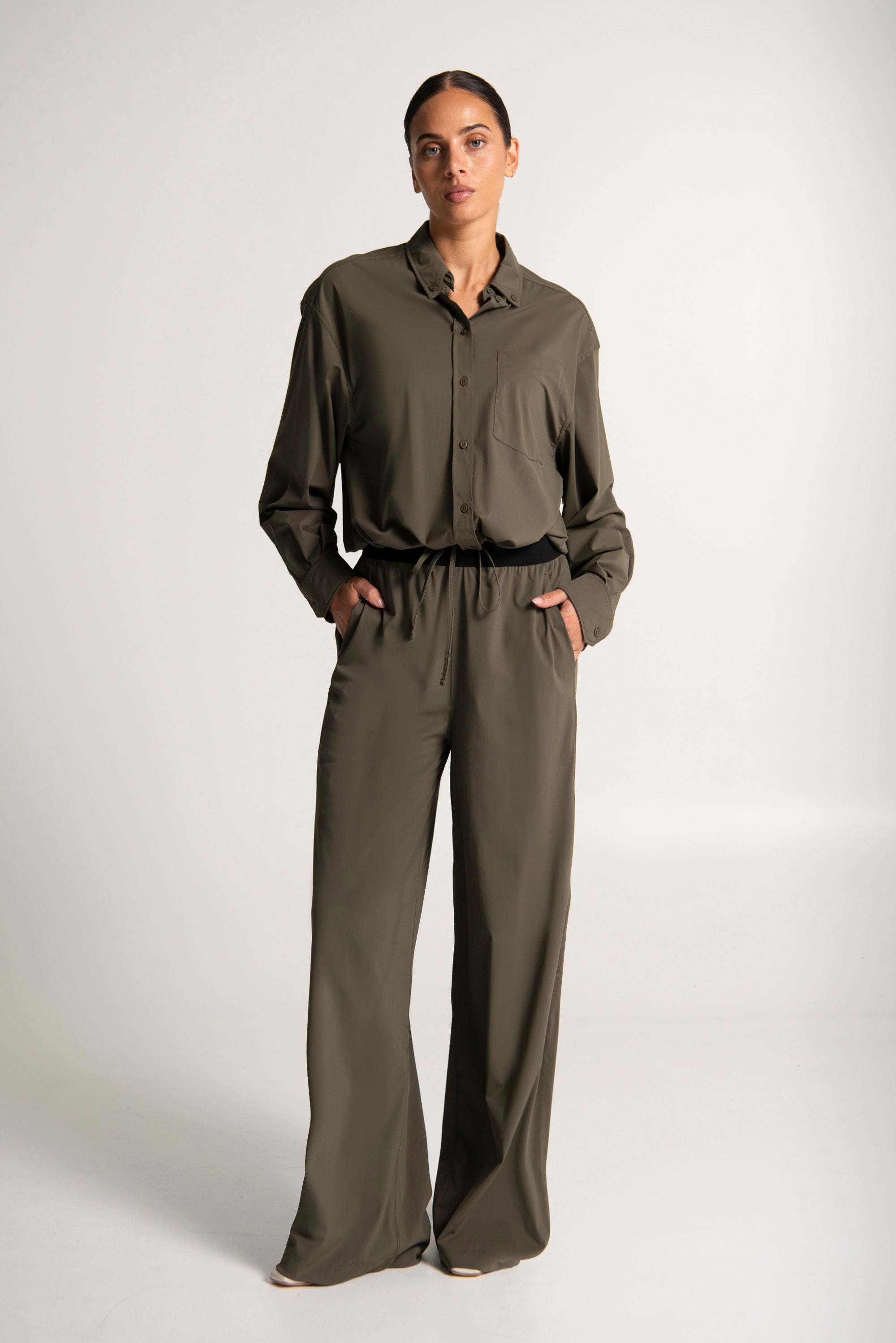 - Drawstring cord at waist that can be pulled in or left relaxed