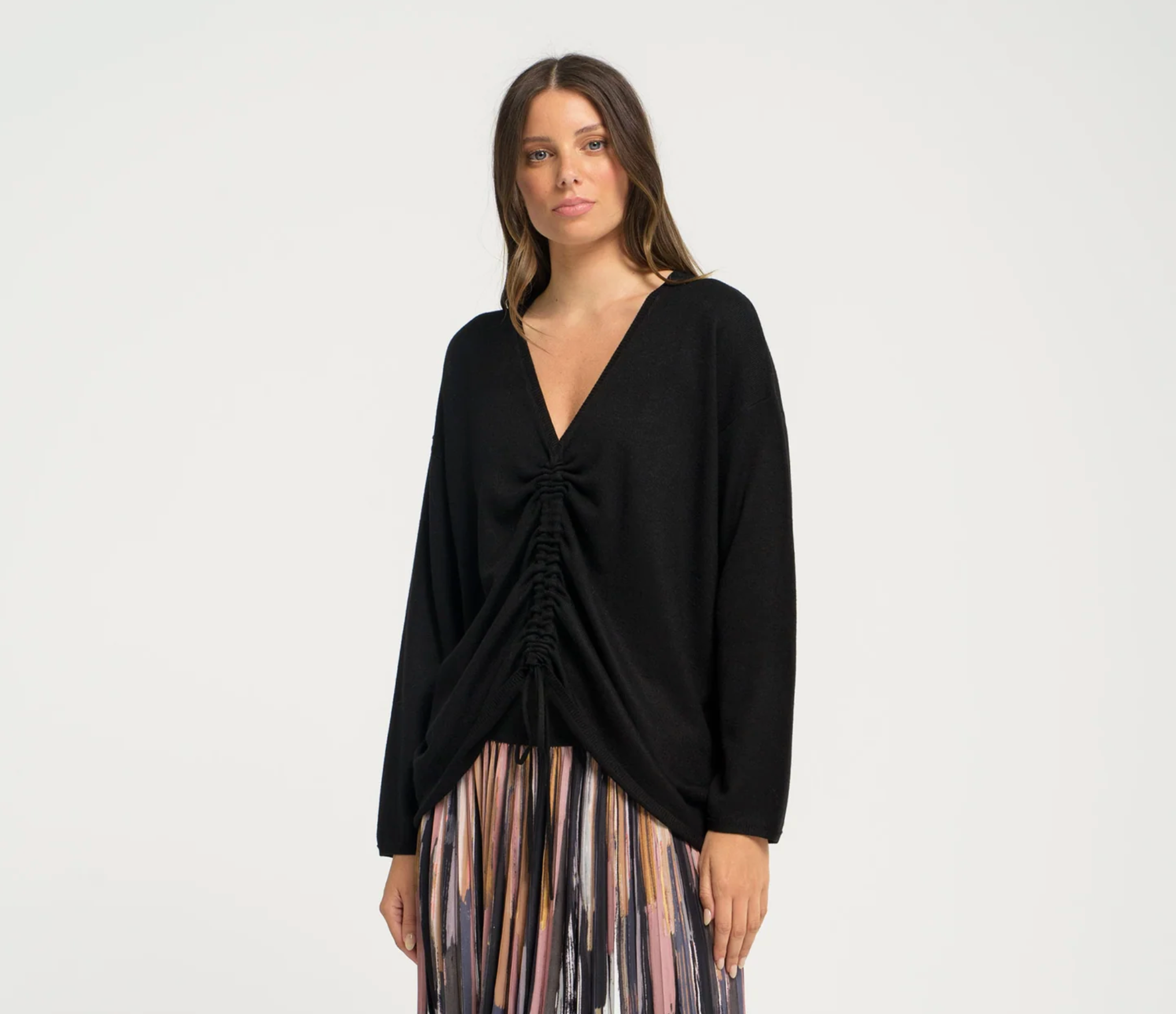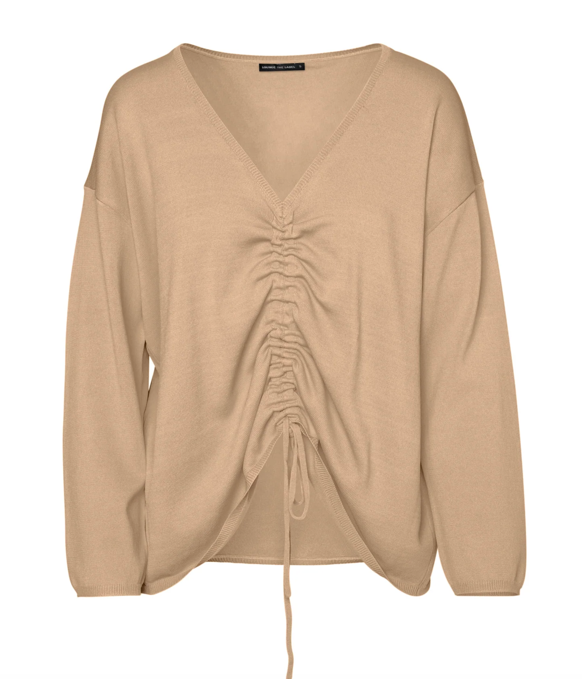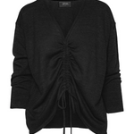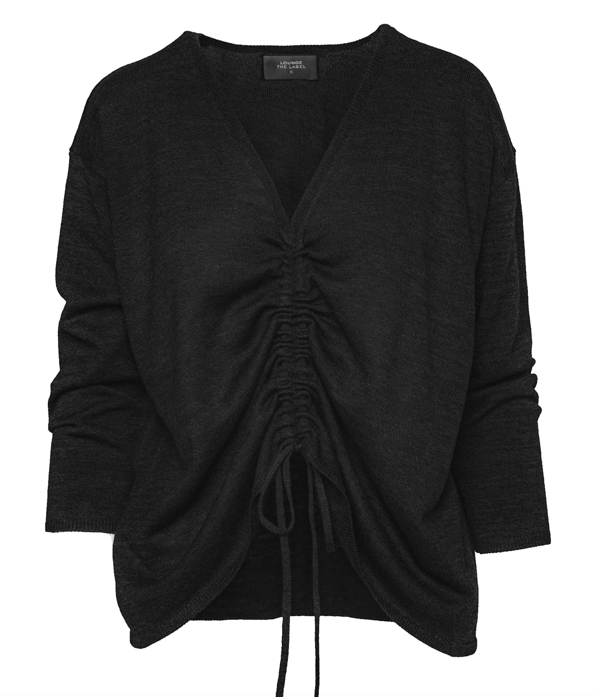 - Narrow v.neck with drawstring detail that can be drawn up or left long for a relaxed look