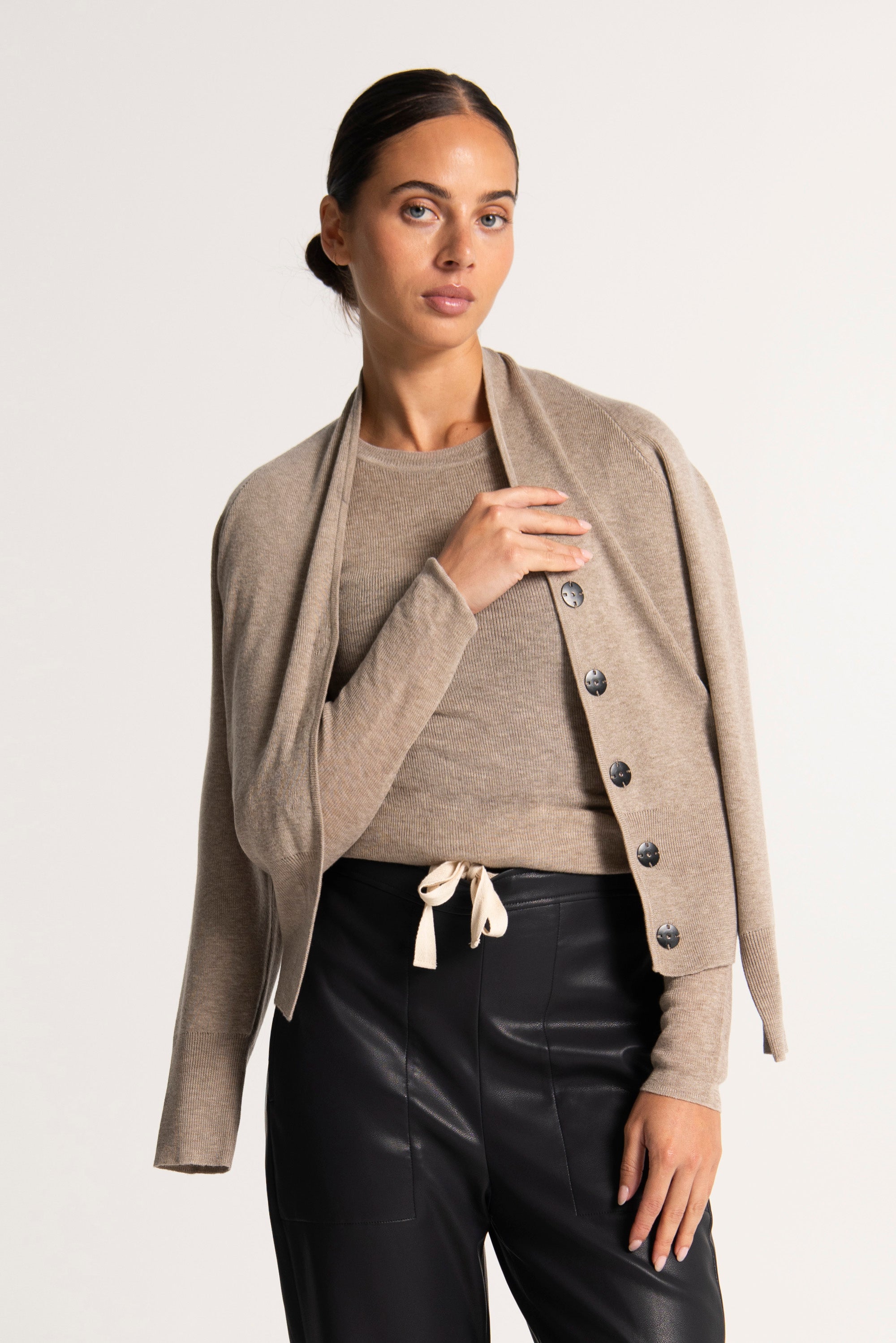 Crafted from a luxurious merino blend, the Lounge the Label Bosa Cardigan is a must-have for any fashion-forward wardrobe. The unique collar design hugs the neckline with a hidden stud front closure, adding an elegant touch. The slight batwing sleeves and wide banded waist create a flattering silhouette, while the ribbed hem edges add texture and style. Perfect for any occasion, this cardigan is a versatile and stylish addition to your collection.