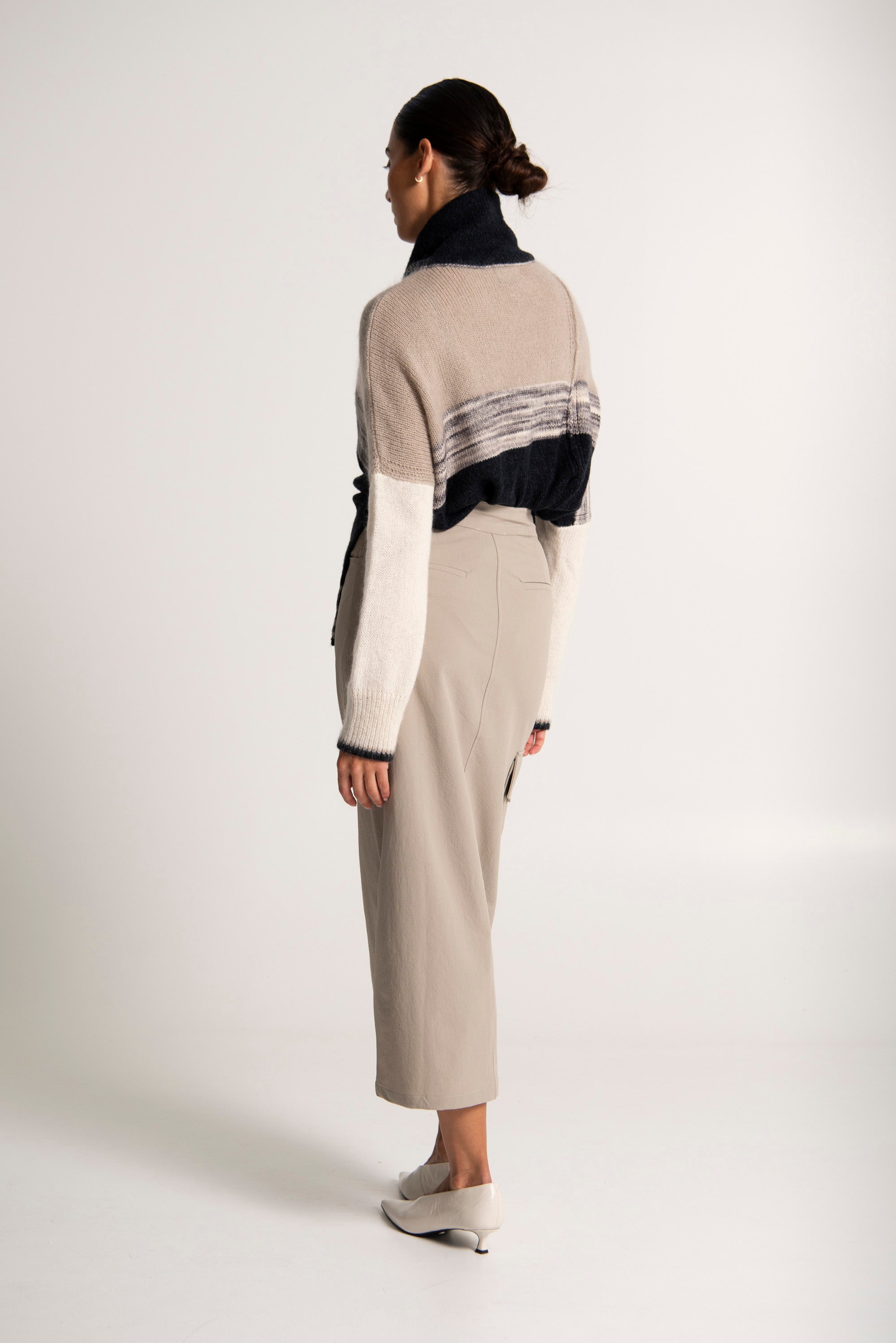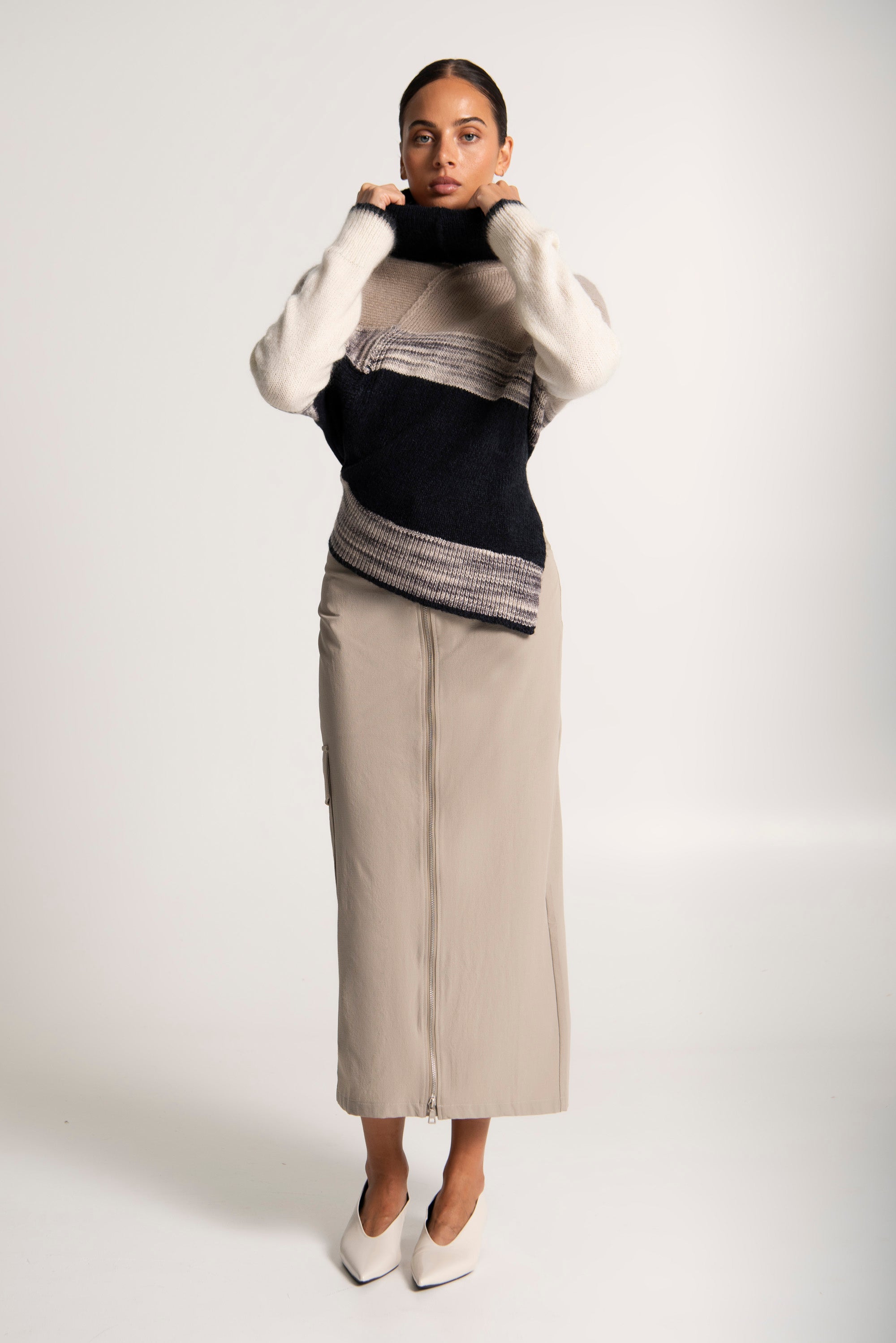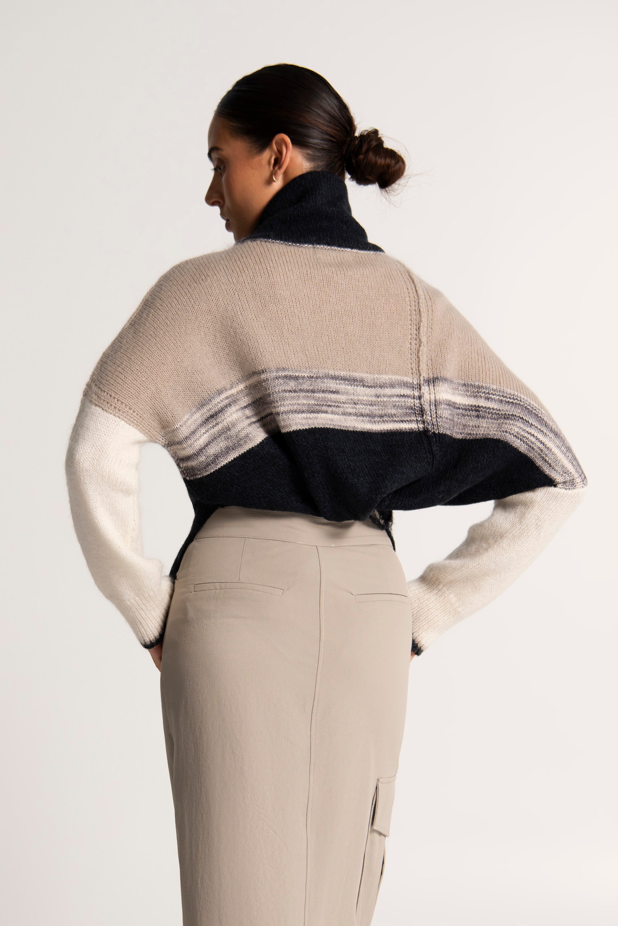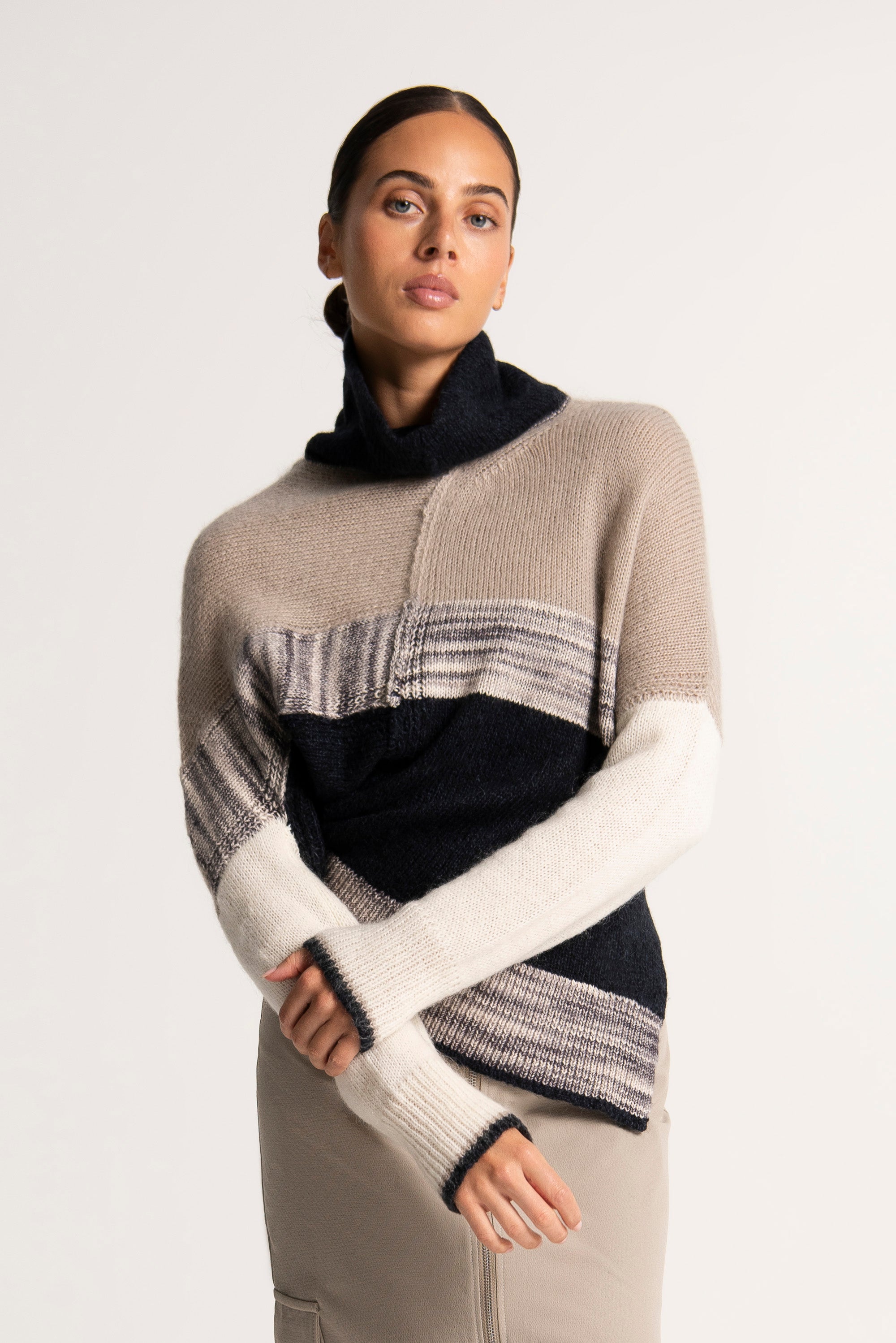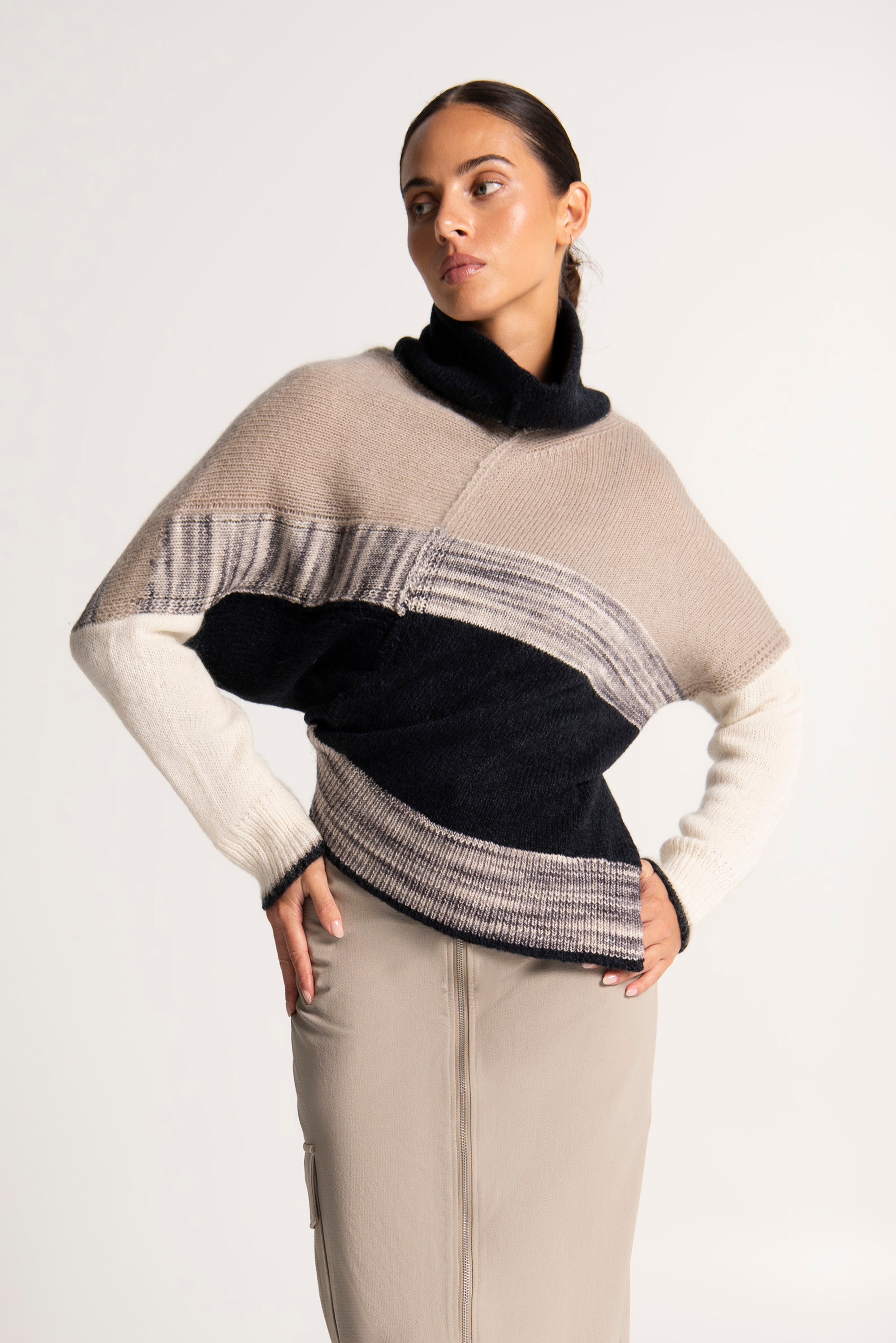 Lounge The Label Knit Tunic Jackson is a striking contemporary take on a classic turtle neck knit sweater. Crafted from a wool acrylic blend, it features asymmetric patch work detail and is finished with rib cuffs and hem. Wear with jeans for a chic casual look or pair back with one of our many Lounge The Label pant options.