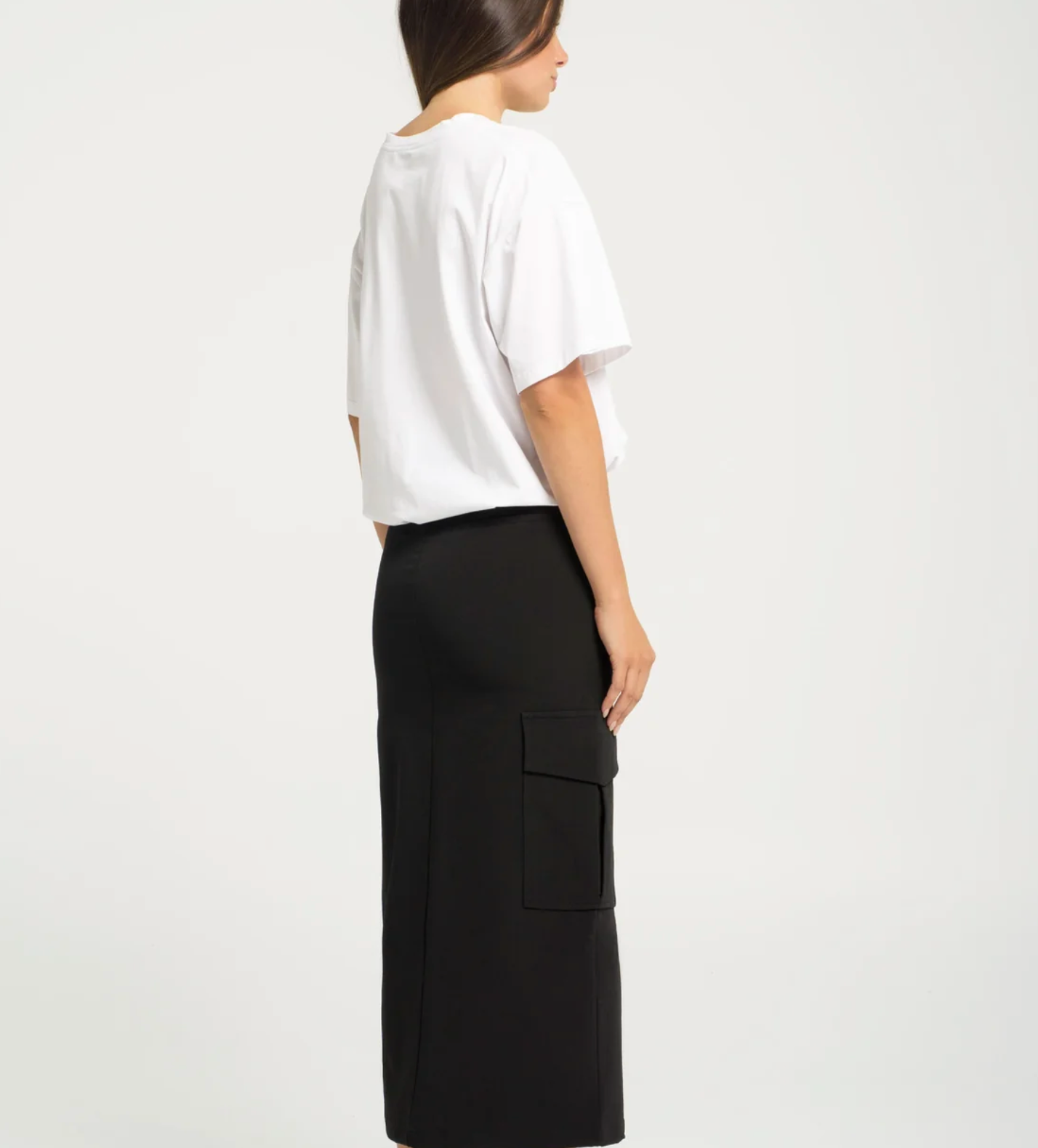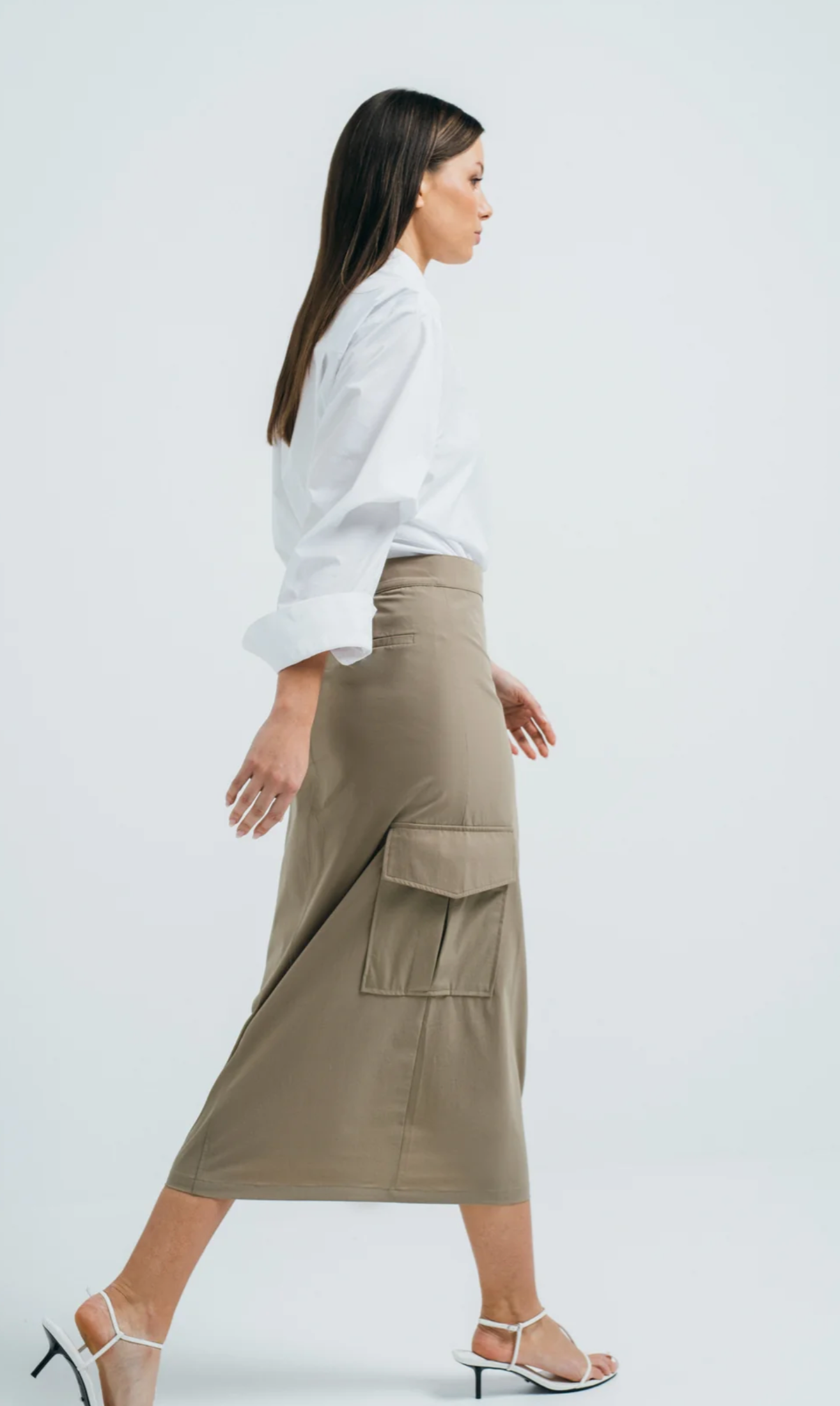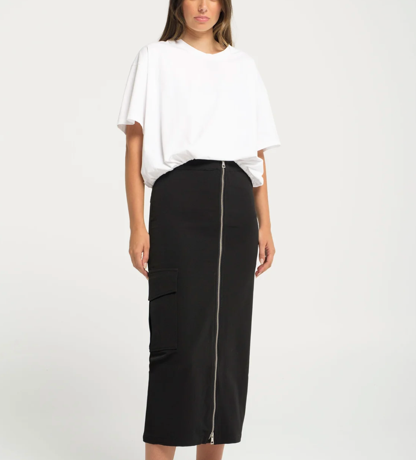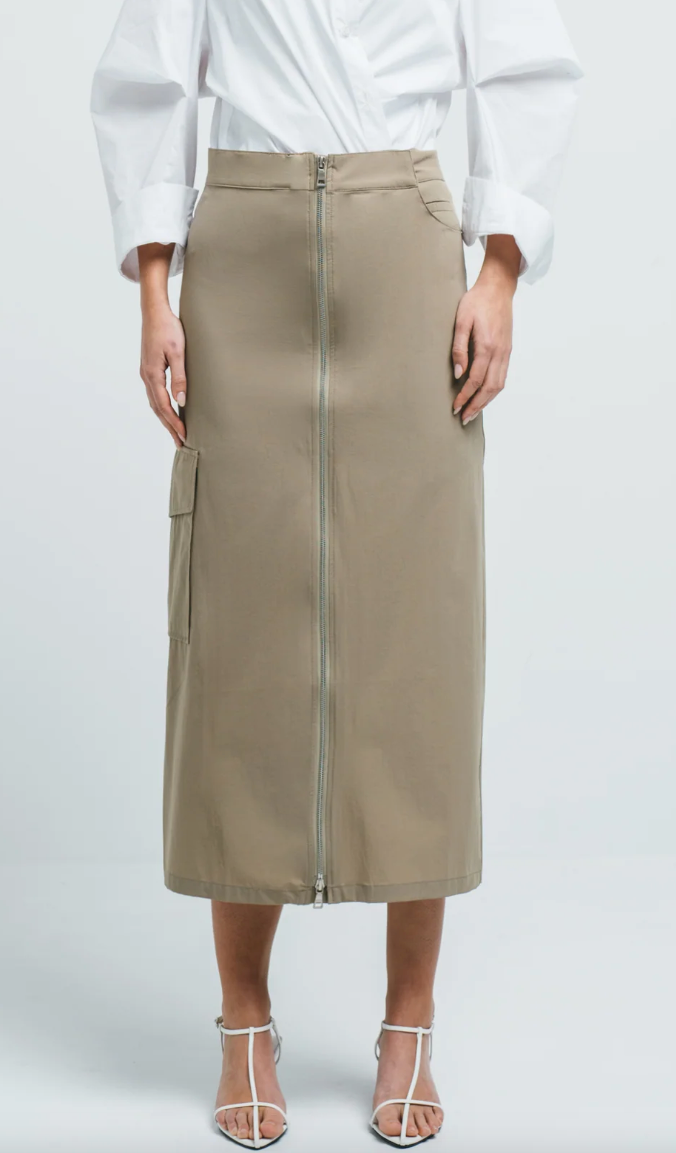 Lounge the Label Skirt Madrid is cut from their luxury stretch woven spandex . It has a dry hand feel with the ease of stretch, there are cargo pocket detail at wearers right hand side and silver metal double slider zip pull at centre front. The skirt is finished with an internal cotton fly front and studs for a flattering fit across waist and back jetted pocket detail.