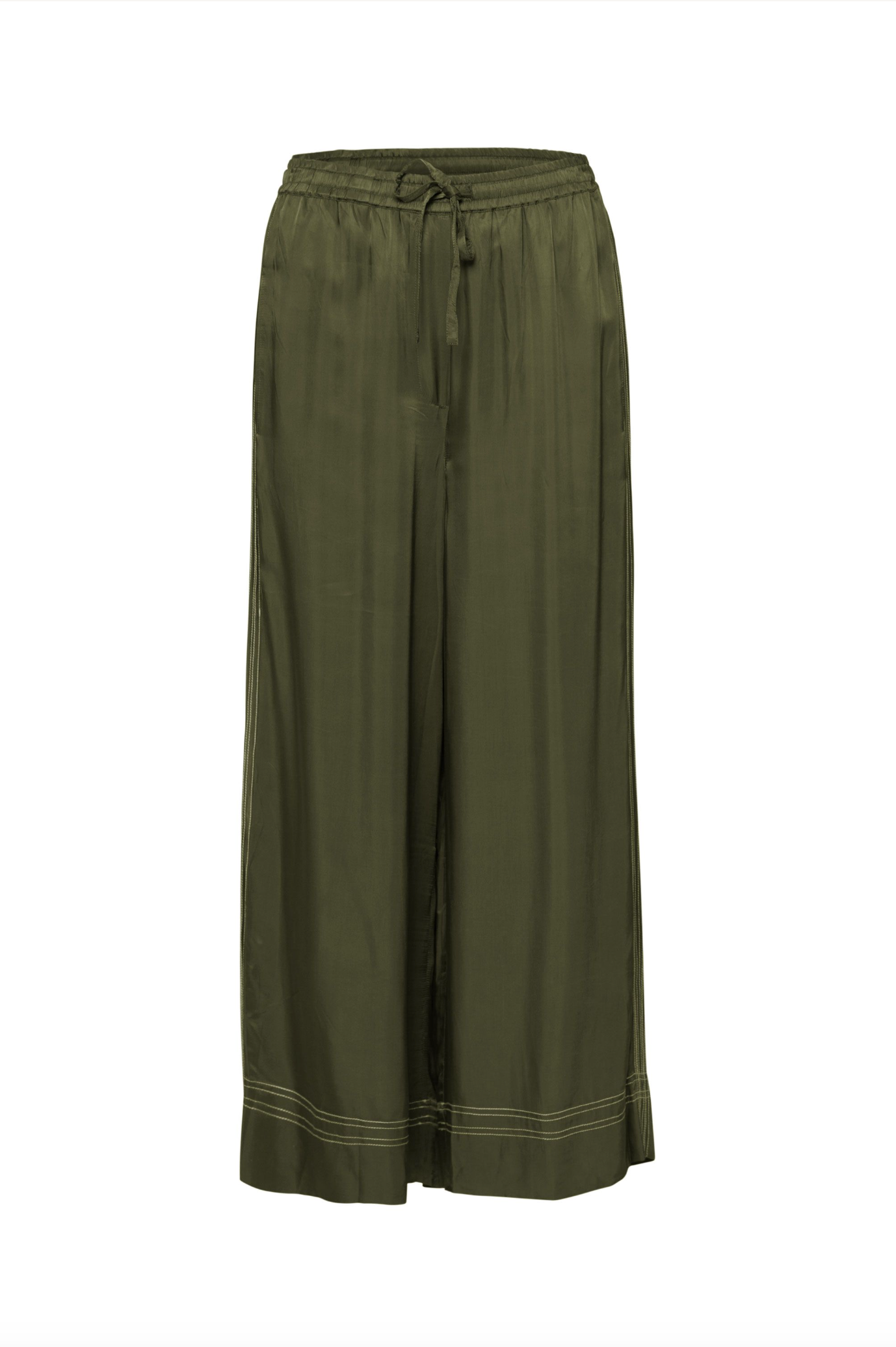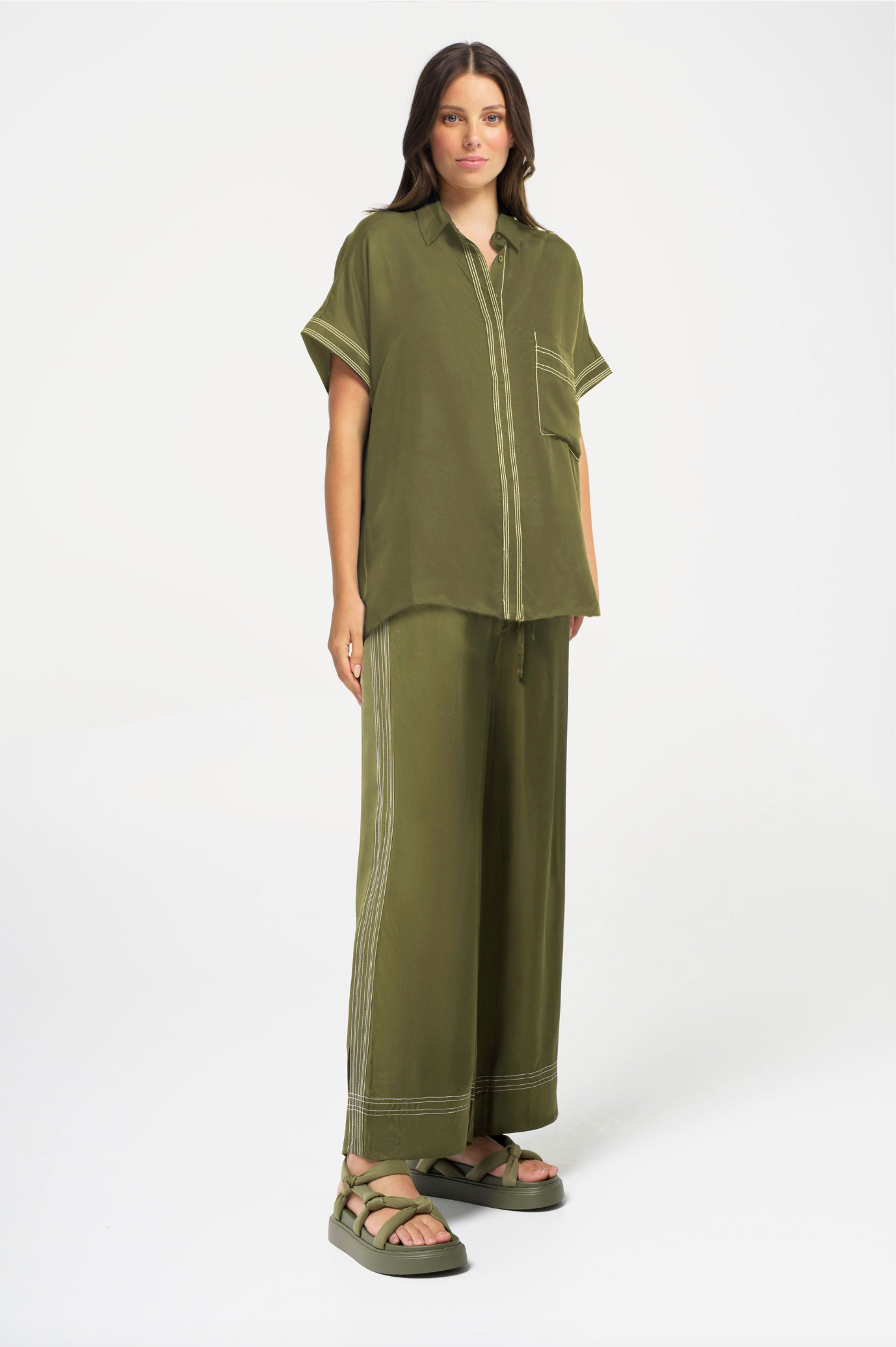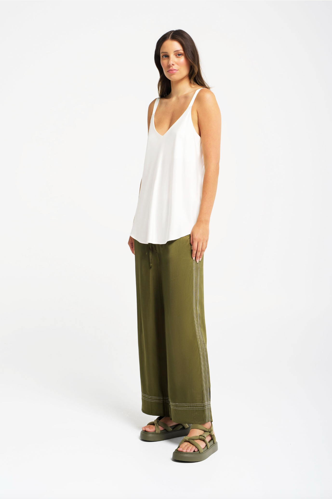 The Lounge The Label Meribel Pant is the perfection. Made from a matt twill viscose fabric, these soft pants feature an elasticated waistband for a comfortable fit. The wide leg design and 7/8 length make them stylish and versatile for any occasion. The white topstitch detailing down the sides and hem adds a touch of sophistication to these must-have pants. Perfect paired back with the Zermat Shirt in Olive.