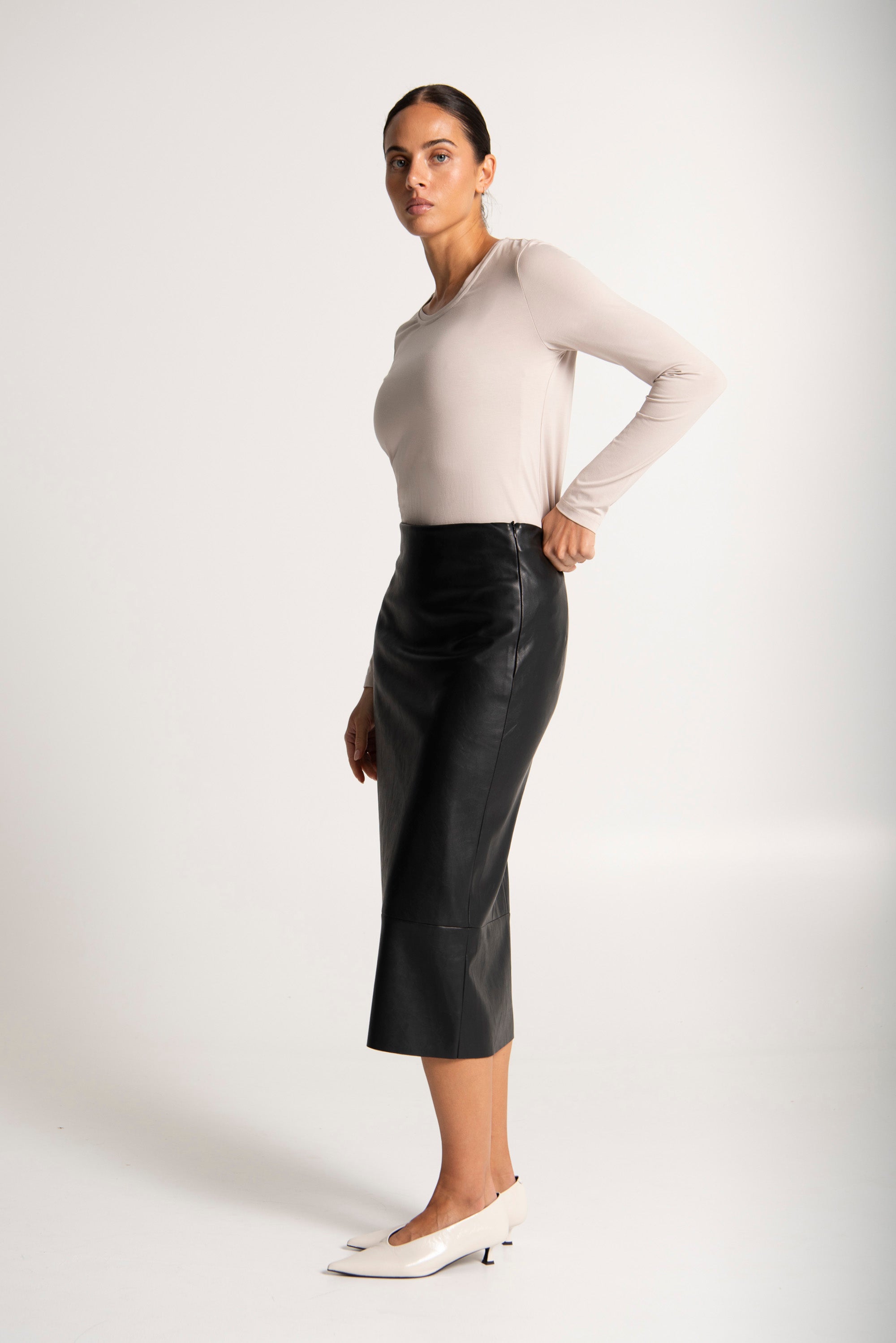 This stylish midi skirt features a classic, elevated design with a slight stretch and an elastic waistband for a comfortable fit. It hits just below the knees, making it perfect for both office and evening wear. The convenient side zip adds a touch of functionality to this chic piece.