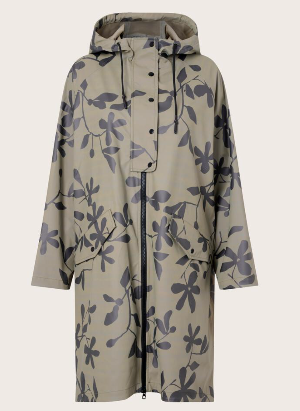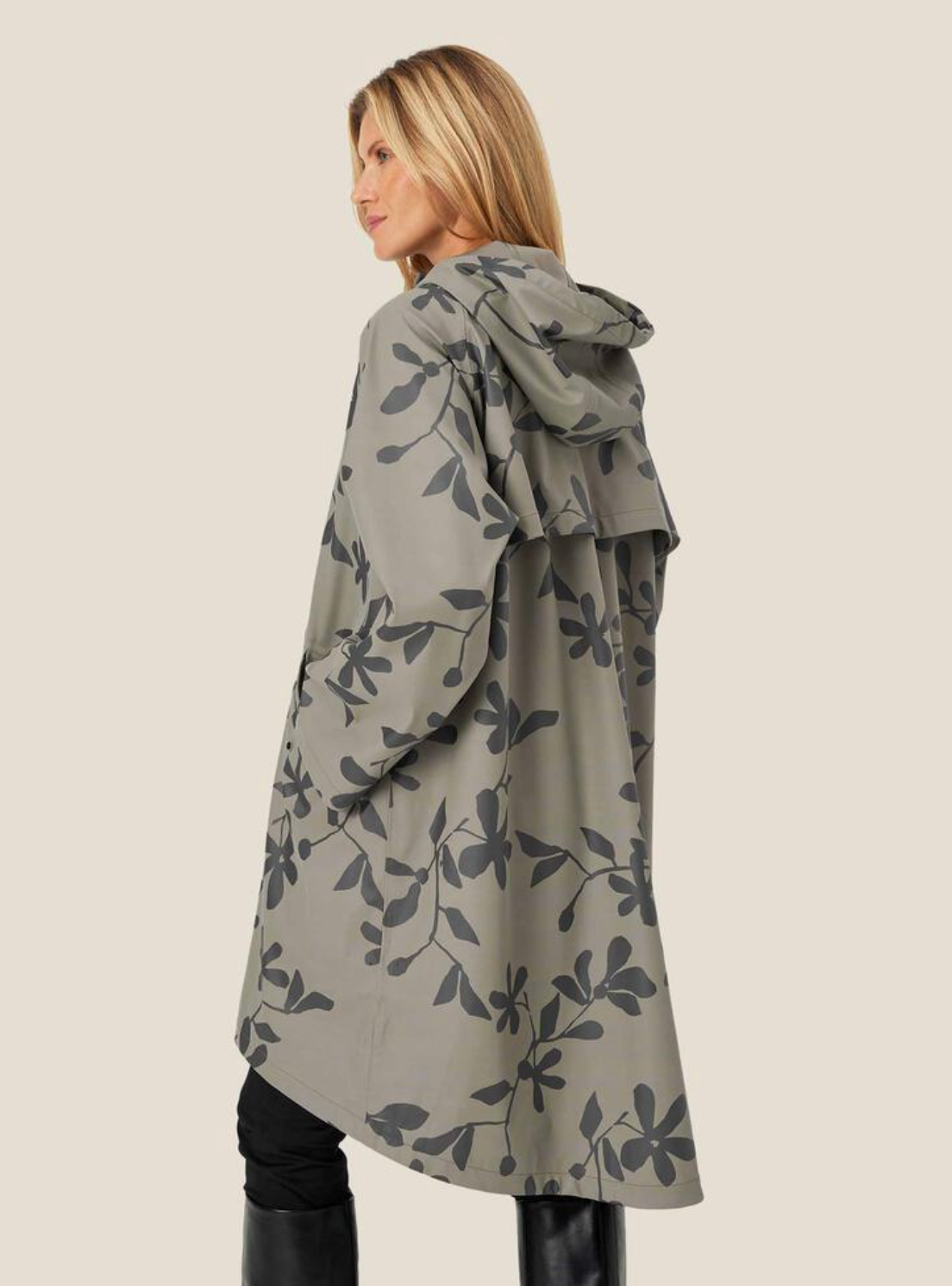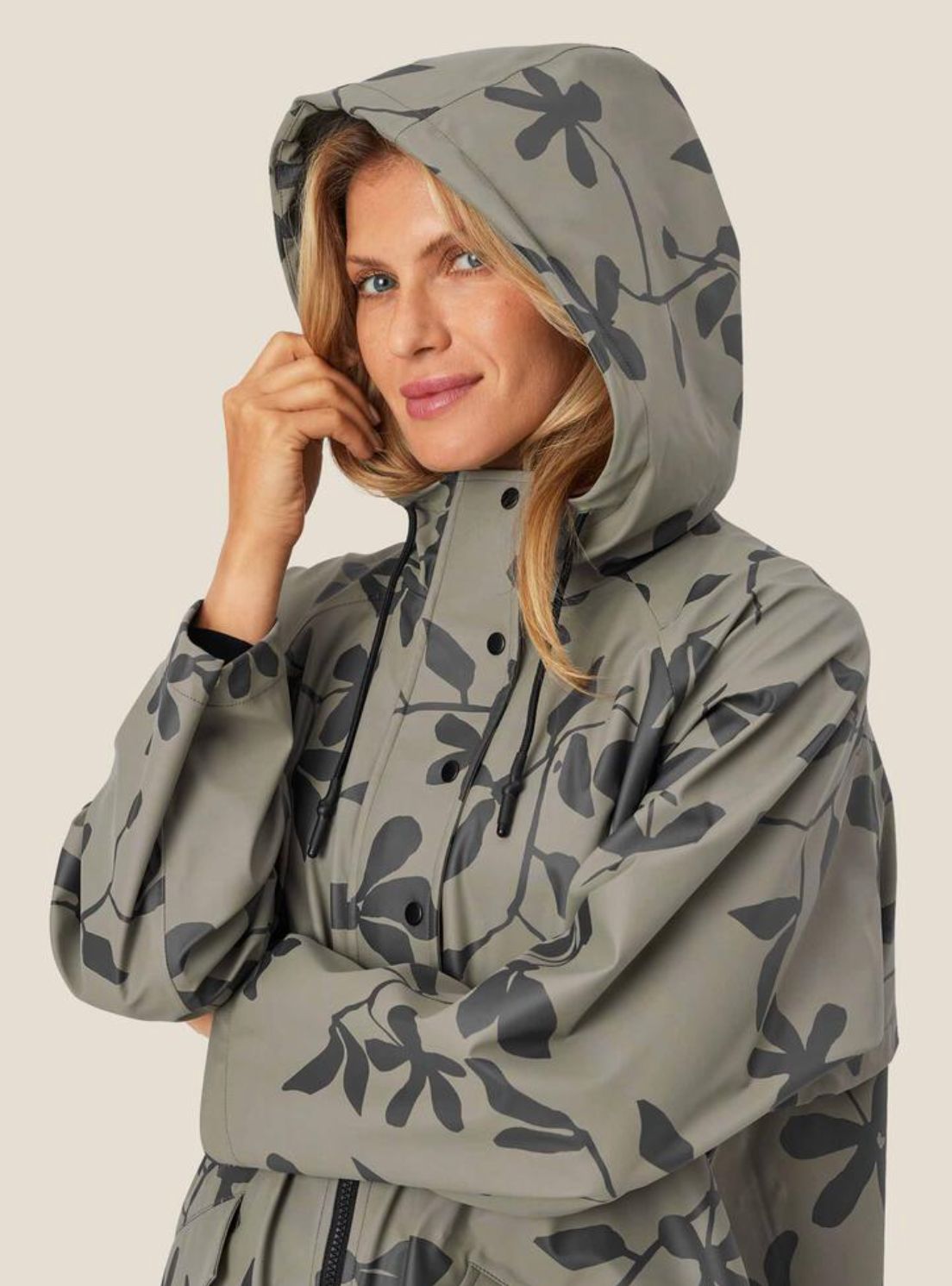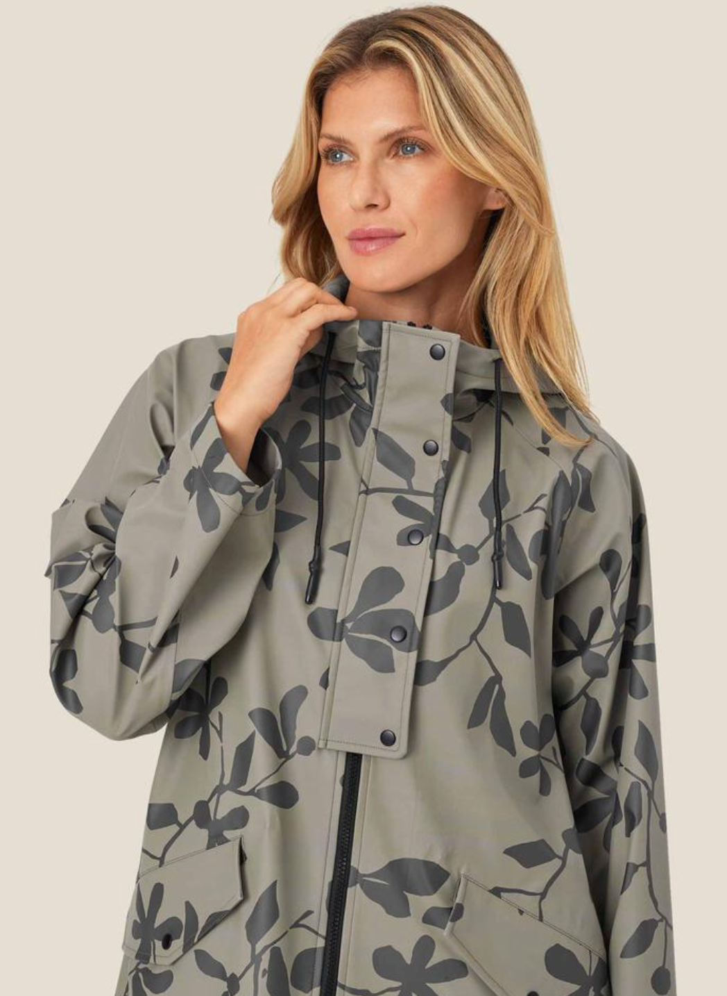 With this feminine raincoat you can defy wind and weather with style. The olive green coat is designed with a stylish, hand-painted floral print - and is full of functional details such as a hood, elasticated cuffs, taped seams and the option to zip up from below when you need more mobility. Also note the breathable mesh on the back and that it is slightly longer at the back. A beautiful raincoat for any weather.
