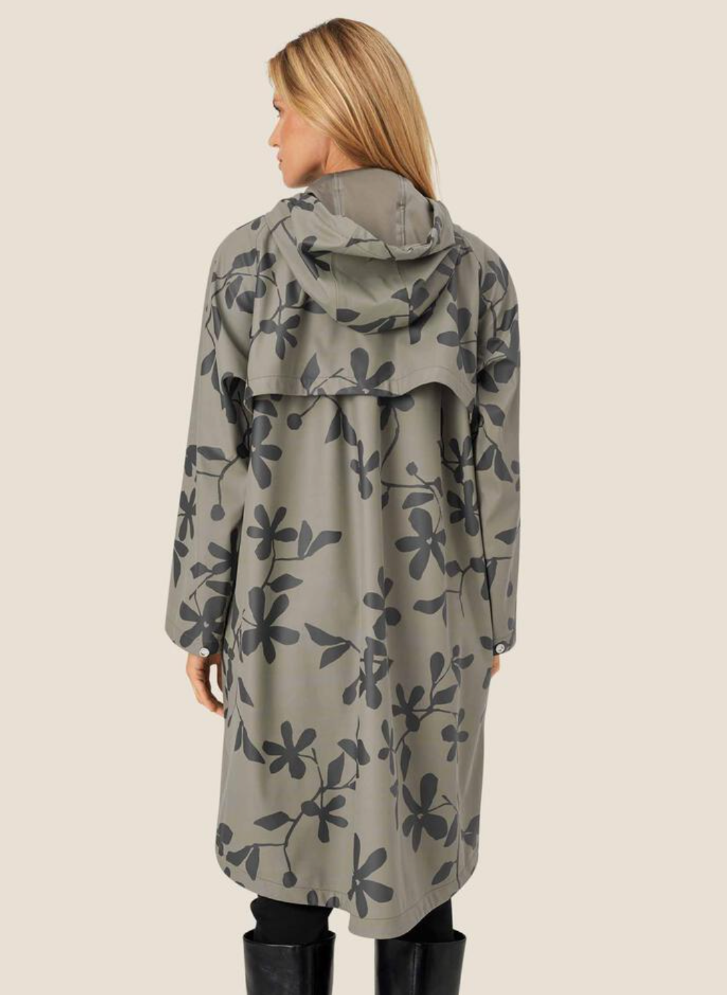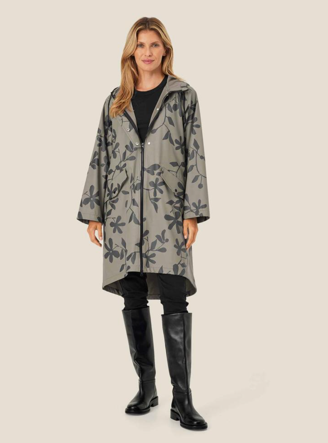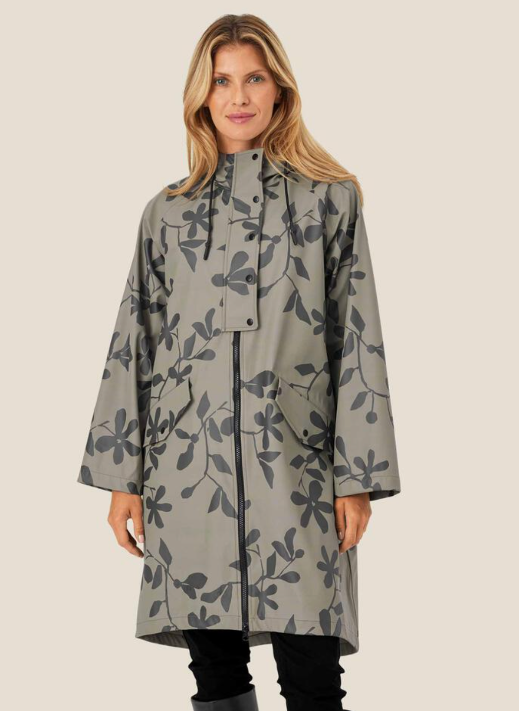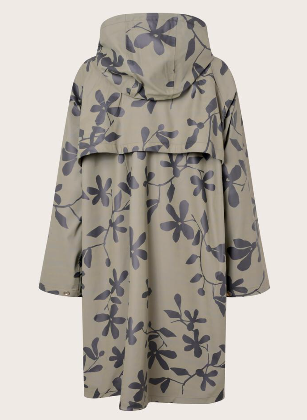 With this feminine raincoat you can defy wind and weather with style. The olive green coat is designed with a stylish, hand-painted floral print - and is full of functional details such as a hood, elasticated cuffs, taped seams and the option to zip up from below when you need more mobility. Also note the breathable mesh on the back and that it is slightly longer at the back. A beautiful raincoat for any weather.