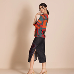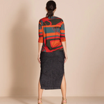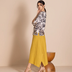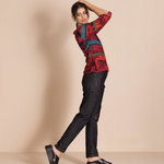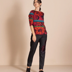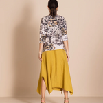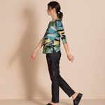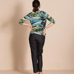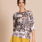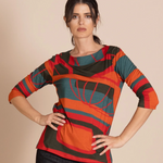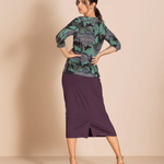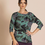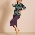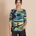 The Audrey tee features original Megan Salmon prints. With a boat neck line and a beautifully finished faced neckband, three-quarter sleeves, and a straight silhouette with side splits. The Audrey tee sits at a flattering length just covering the top part of the hip. Neat and versatile, ideal for layering under jackets or wearing over skirts and trousers. Made from viscose lycra, ensuring a soft and breathable feel on the body.