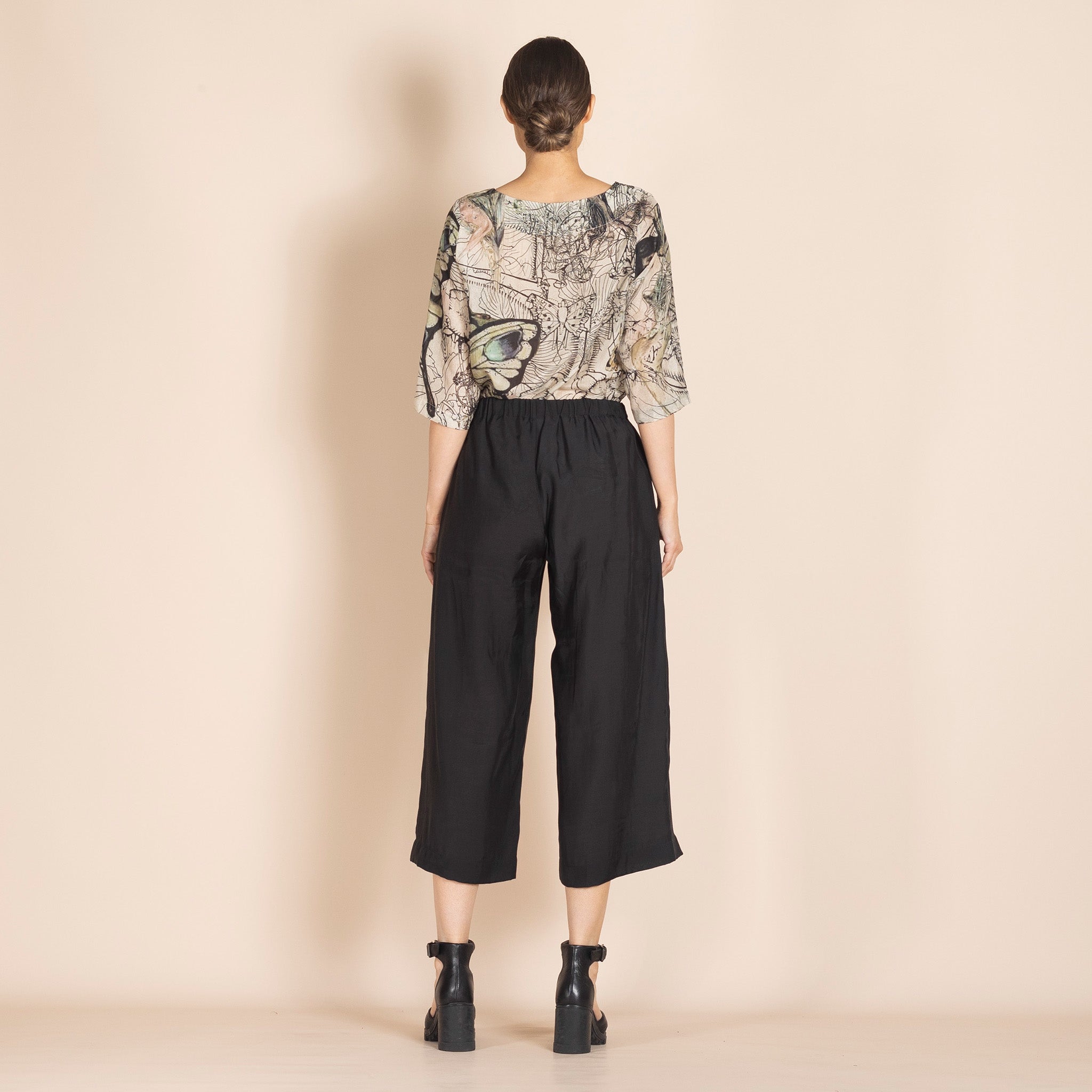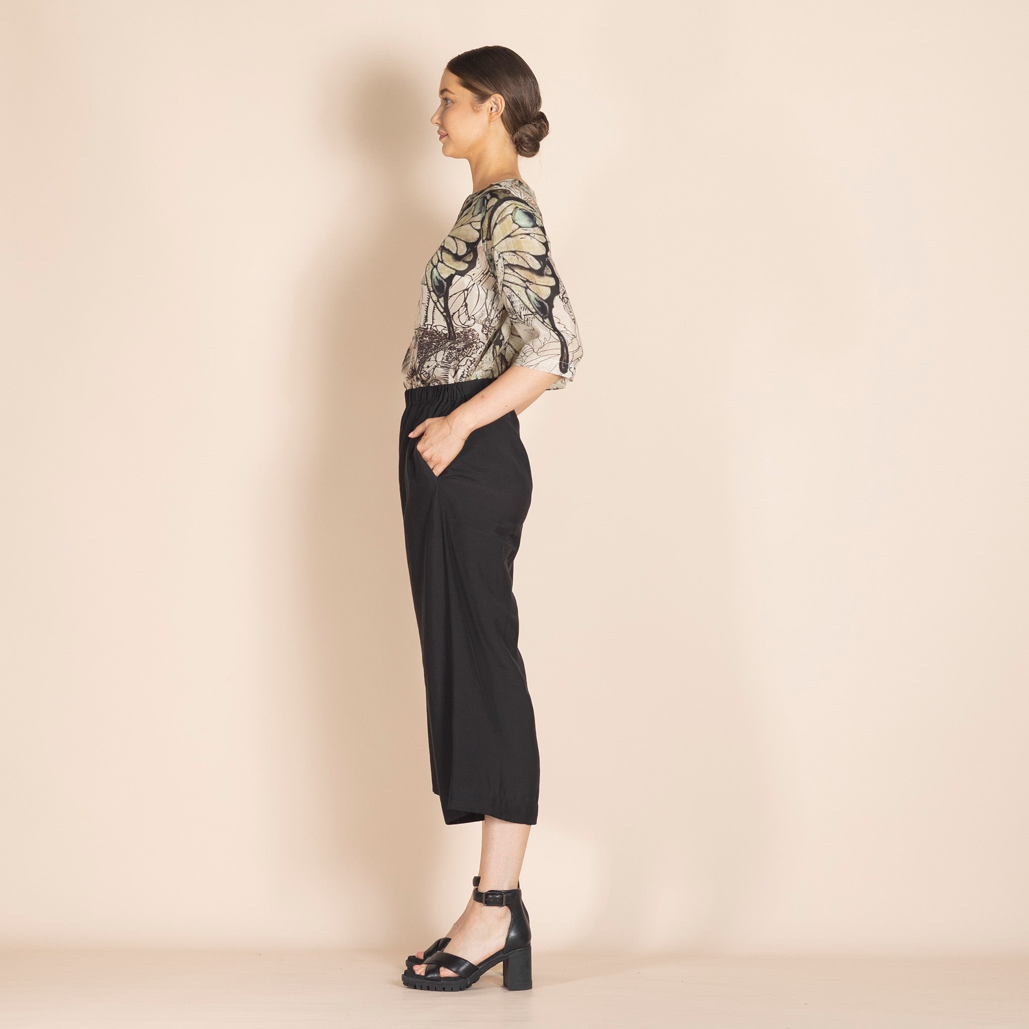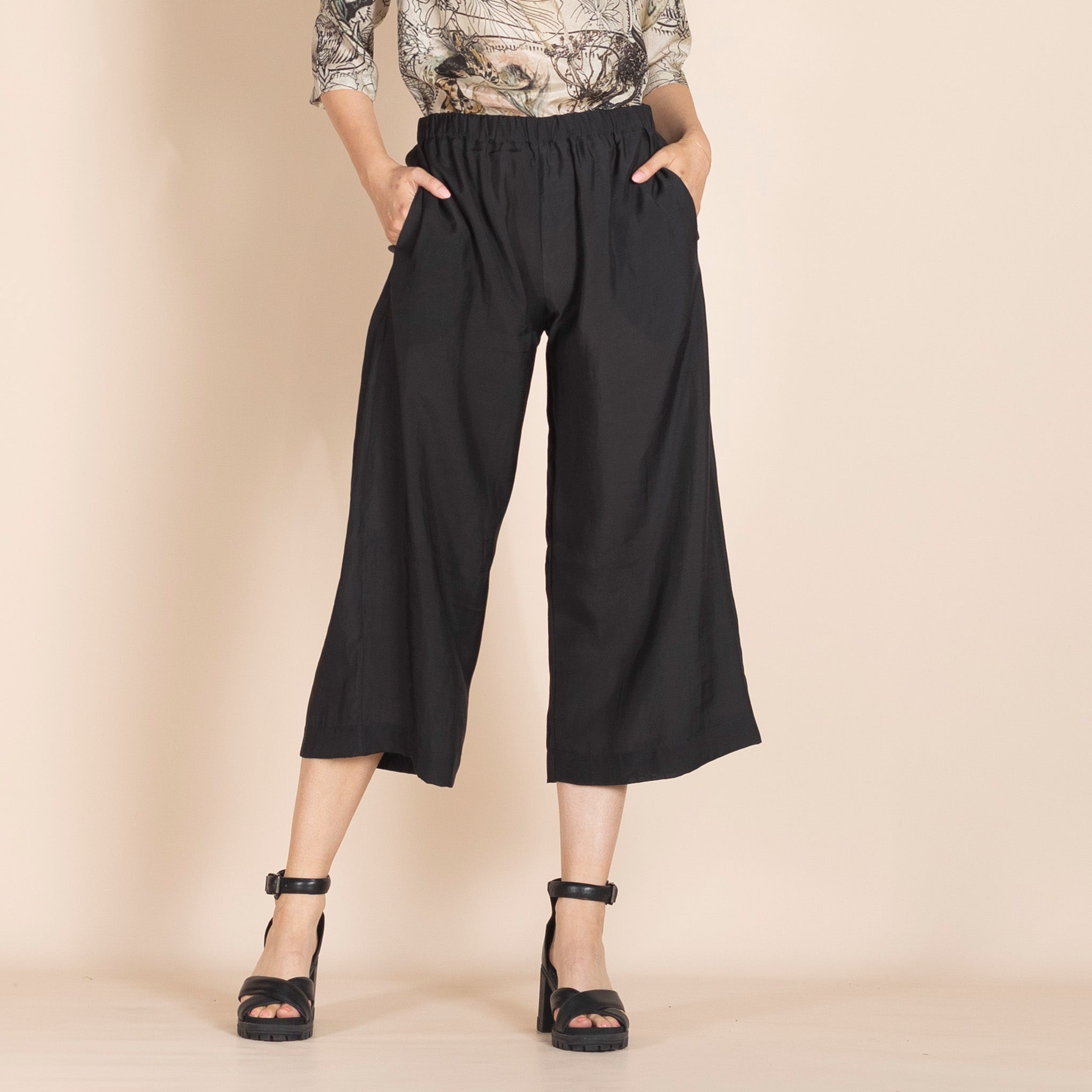 These pants are wide, 7/8 in length and have elastic at the waist. They are called lounge pants for a reason. They are comfy and soft and will be your go to for relaxing in. Take them from work to play as the bamboo fabric is soft, lightweight and lovely to wear.