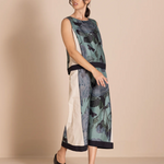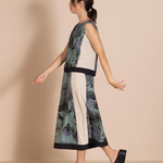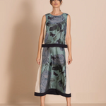 This simple a-line is the perfect canvas for showcasing the beautiful large format florals with dark bold butterflies scattered throughout on a base of teal blues and greens with hints of blush purple.