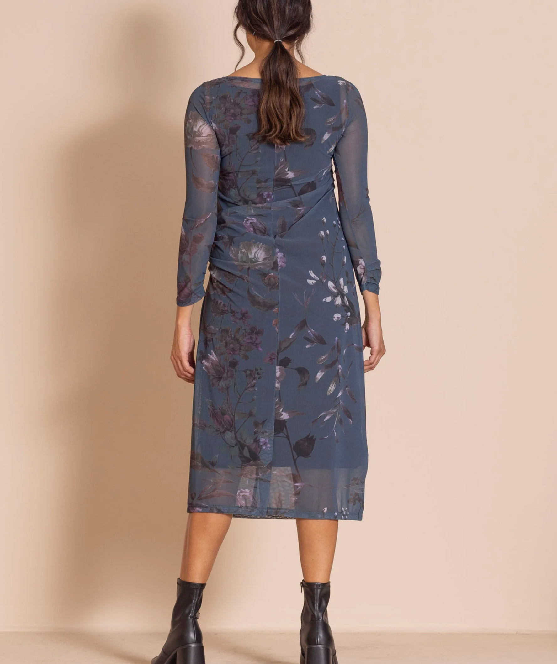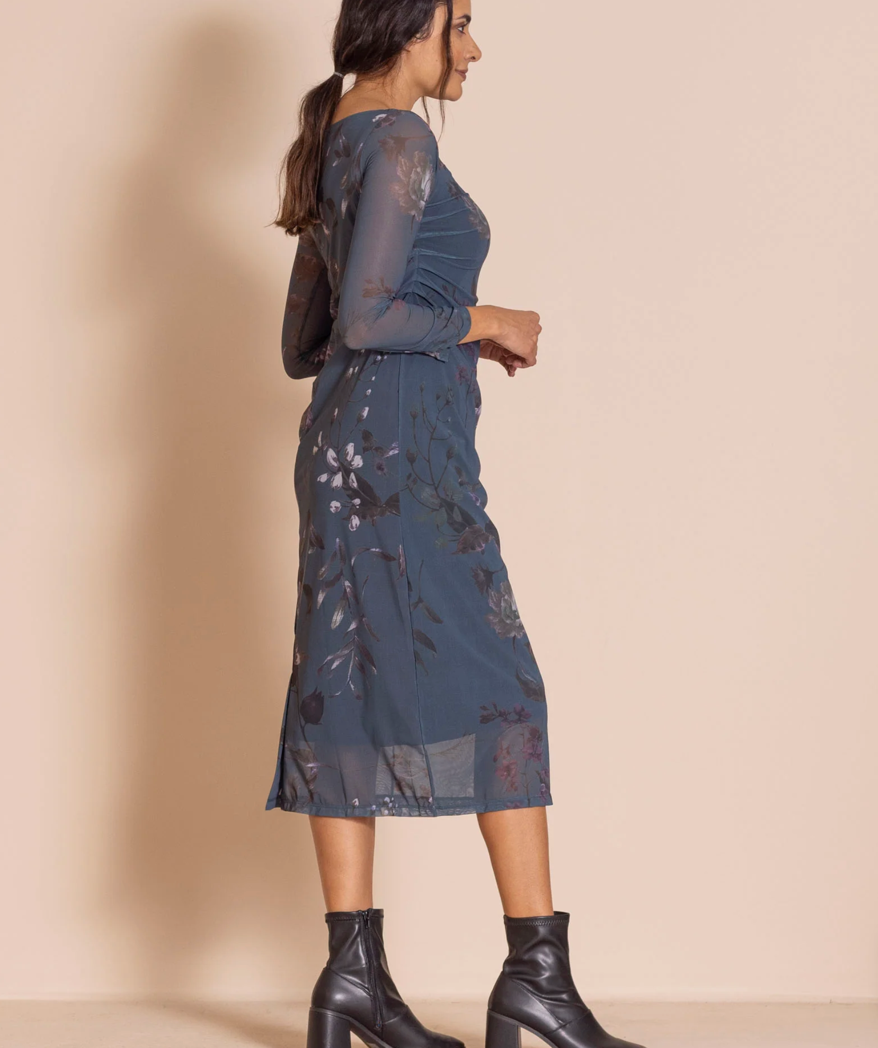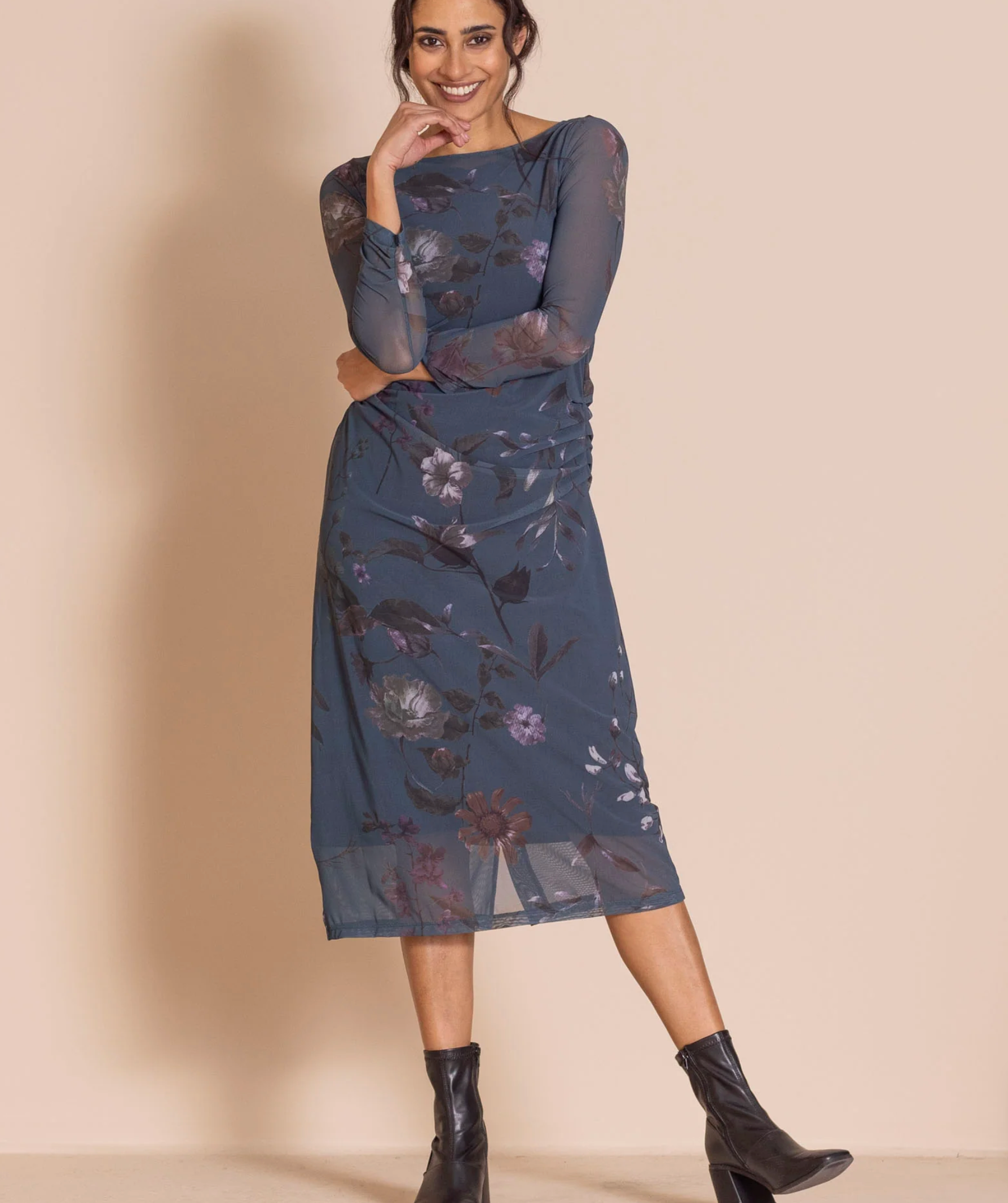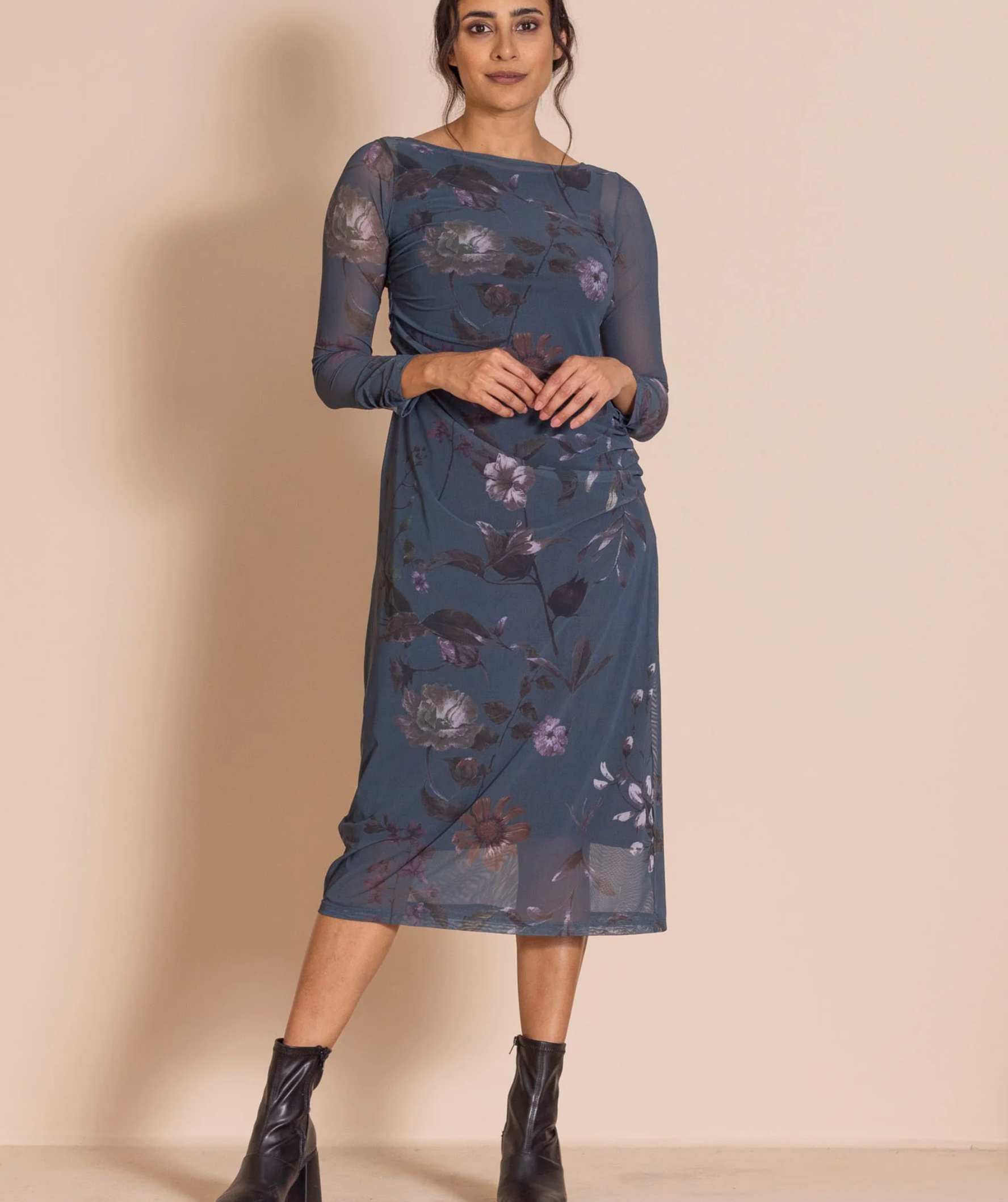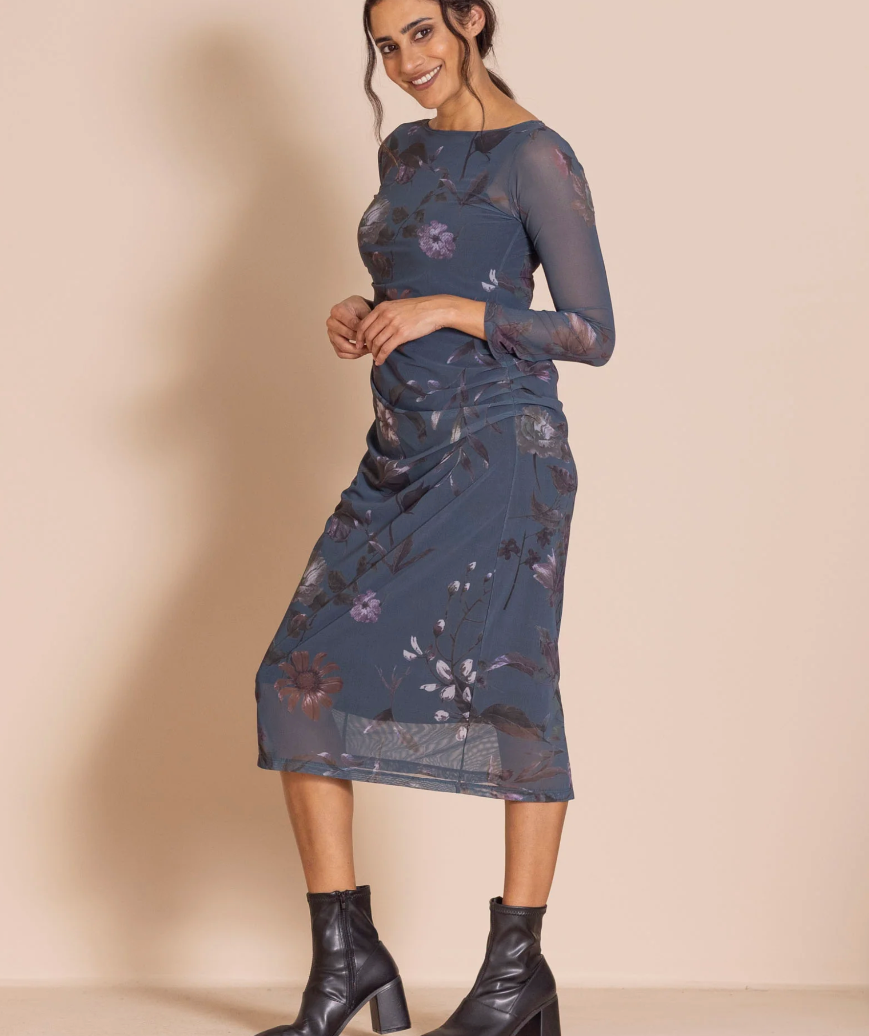 The floral mesh ruched dress is a straight through dress made from mesh with the detail of ruching at the bust and hips.