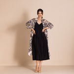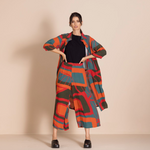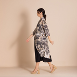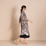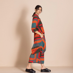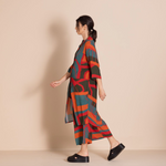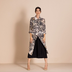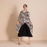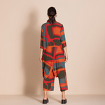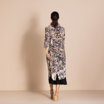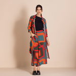 The Long Envelope Shirt showcases two striking original prints by Megan Salmon in for the summer season. This distinctive long shirt features 3/4 sleeves, stitched down side pockets, a traditional shirt collar, and a button-down front that extends to a dropped waistline before opening into a flowing split. The back mirrors this unique design with an overlapping center-back split, also beginning at the dropped waist. With its blend of tailored detail and free-flowing silhouette, this shirt embodies a modern bohemian aesthetic.