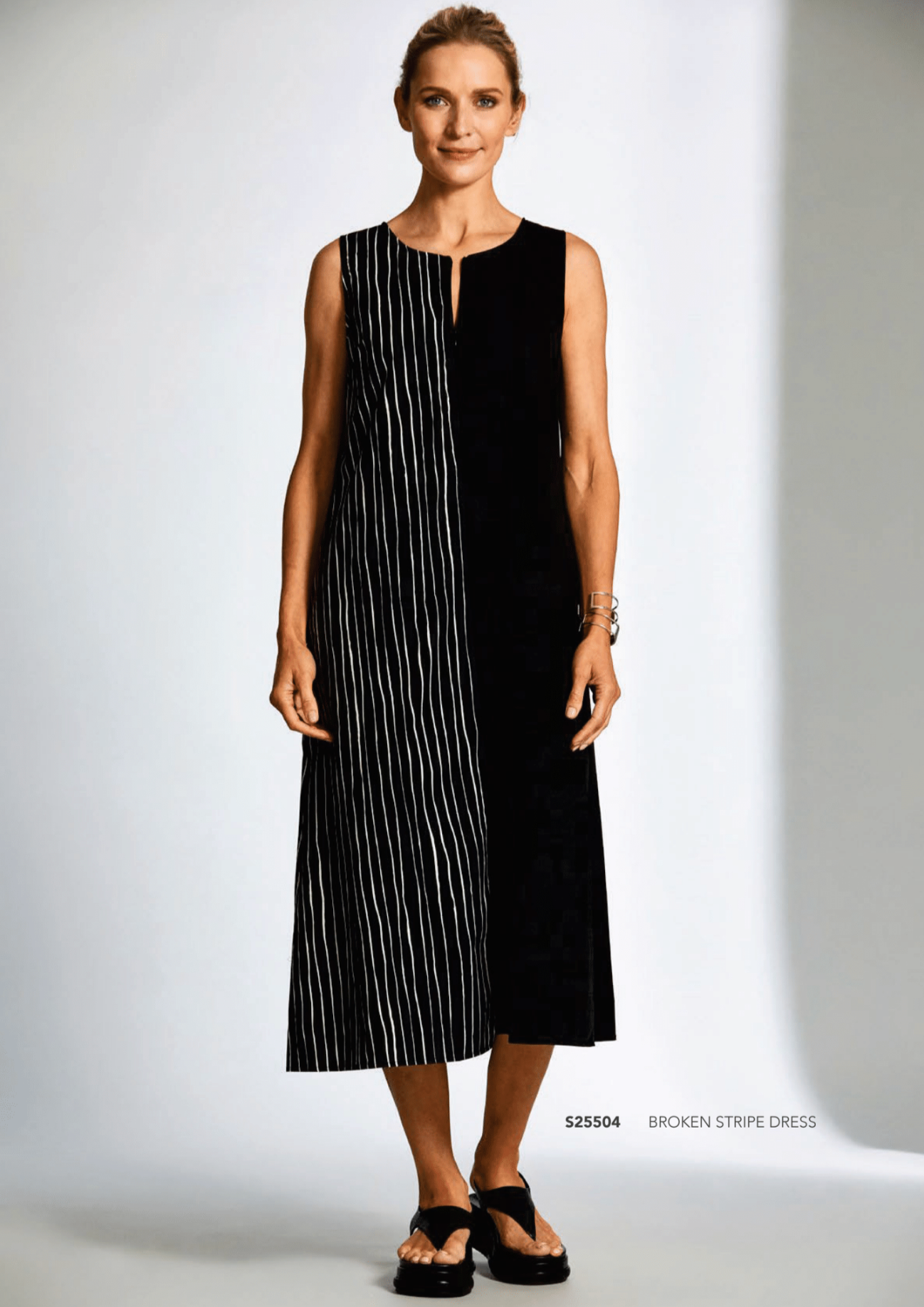 Crafted from a breathable blend of viscose and linen, this dress offers a lightweight and comfortable feel. Featuring a long, sleeveless design with a flattering V-neckline, it drapes beautifully in a relaxed fit. The broken stripe pattern adds a modern touch, making it a versatile choice for both casual and smart-casual occasions.