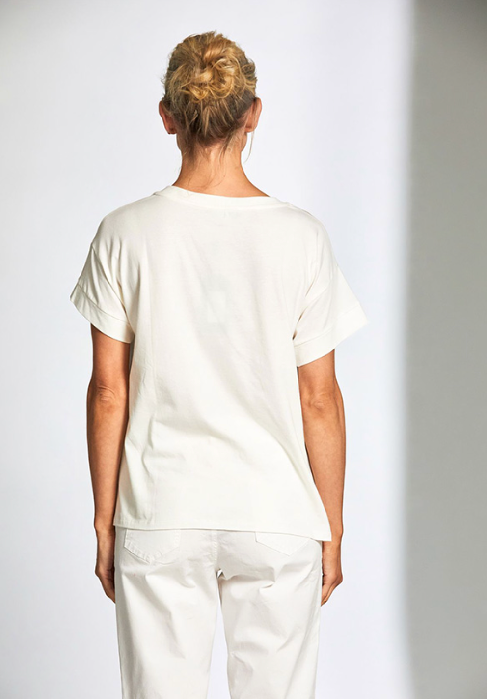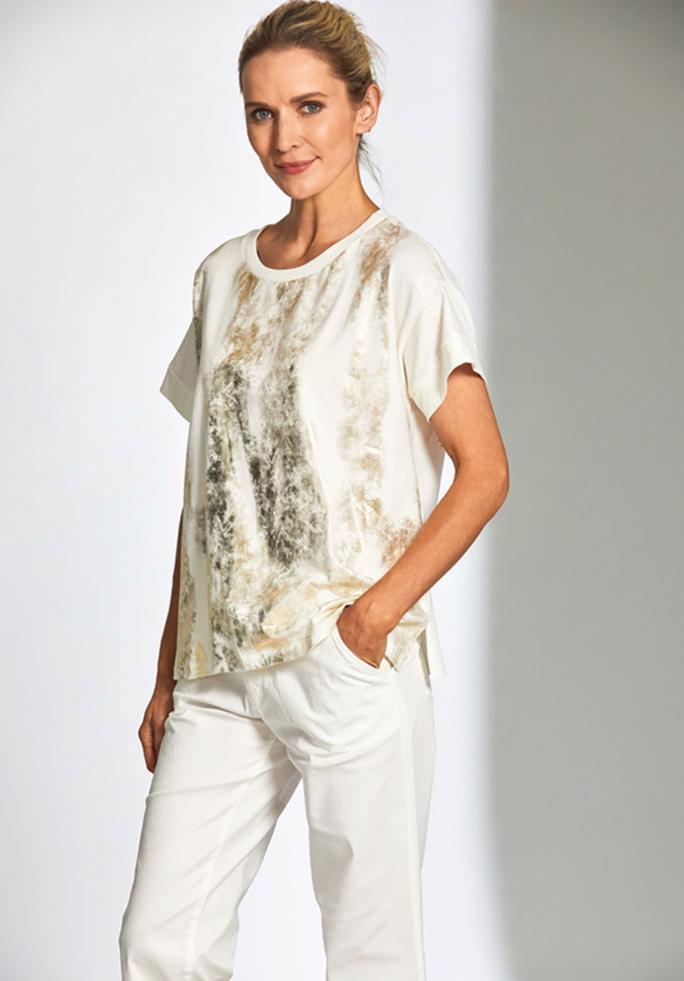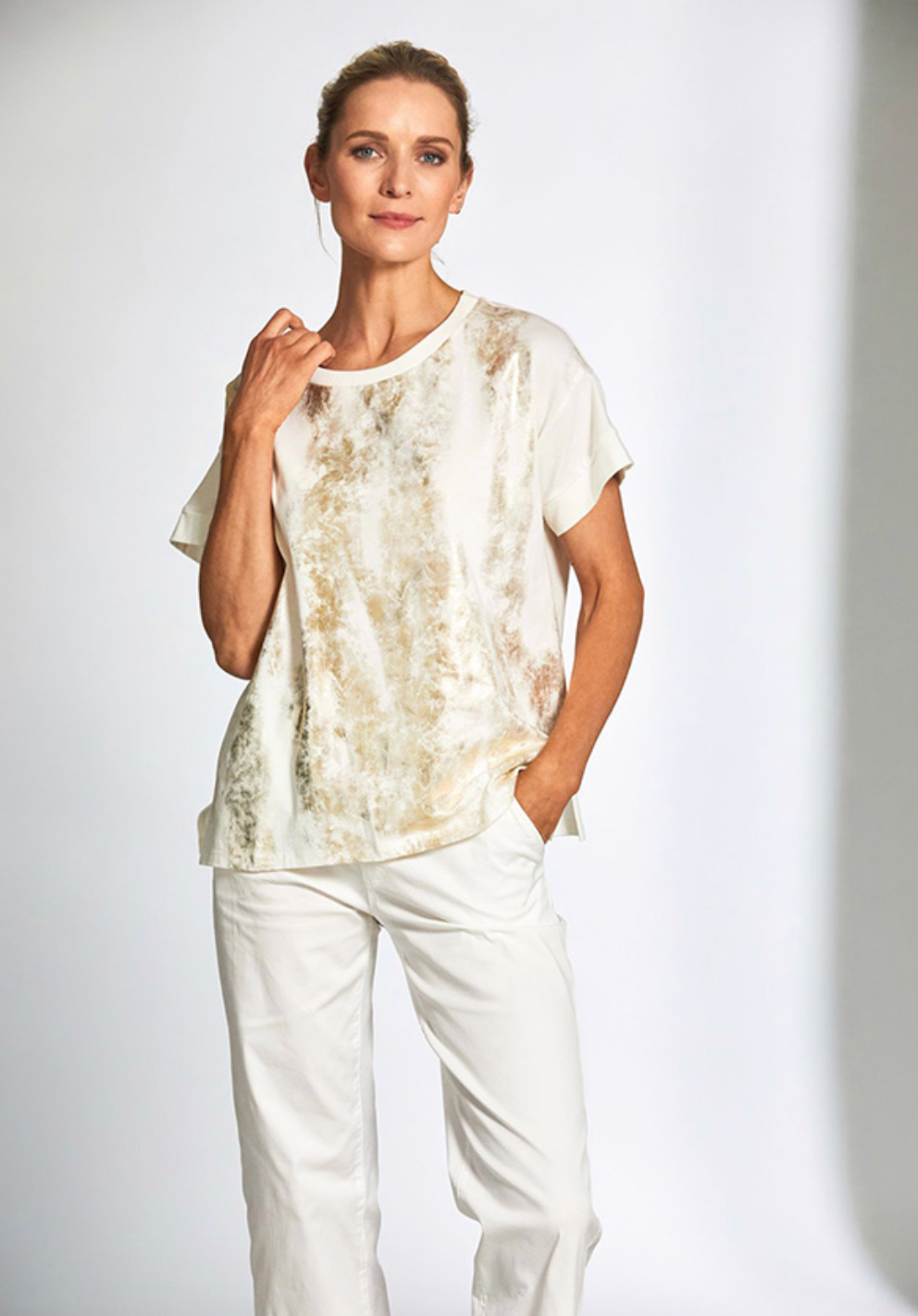 The Peruzzi Metalic Front Top Golden/Ecru features short shoulder covering sleeves and a round neckline.