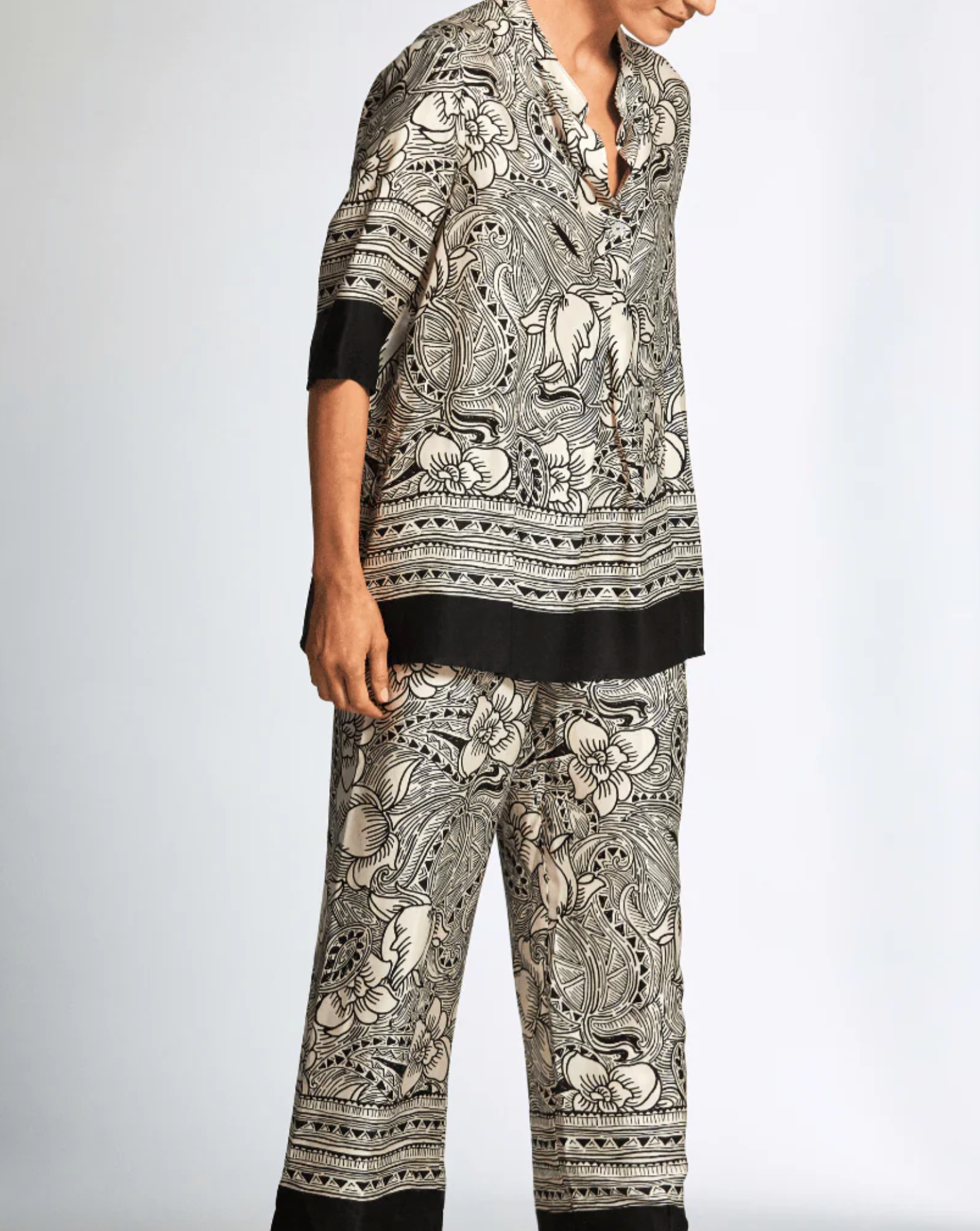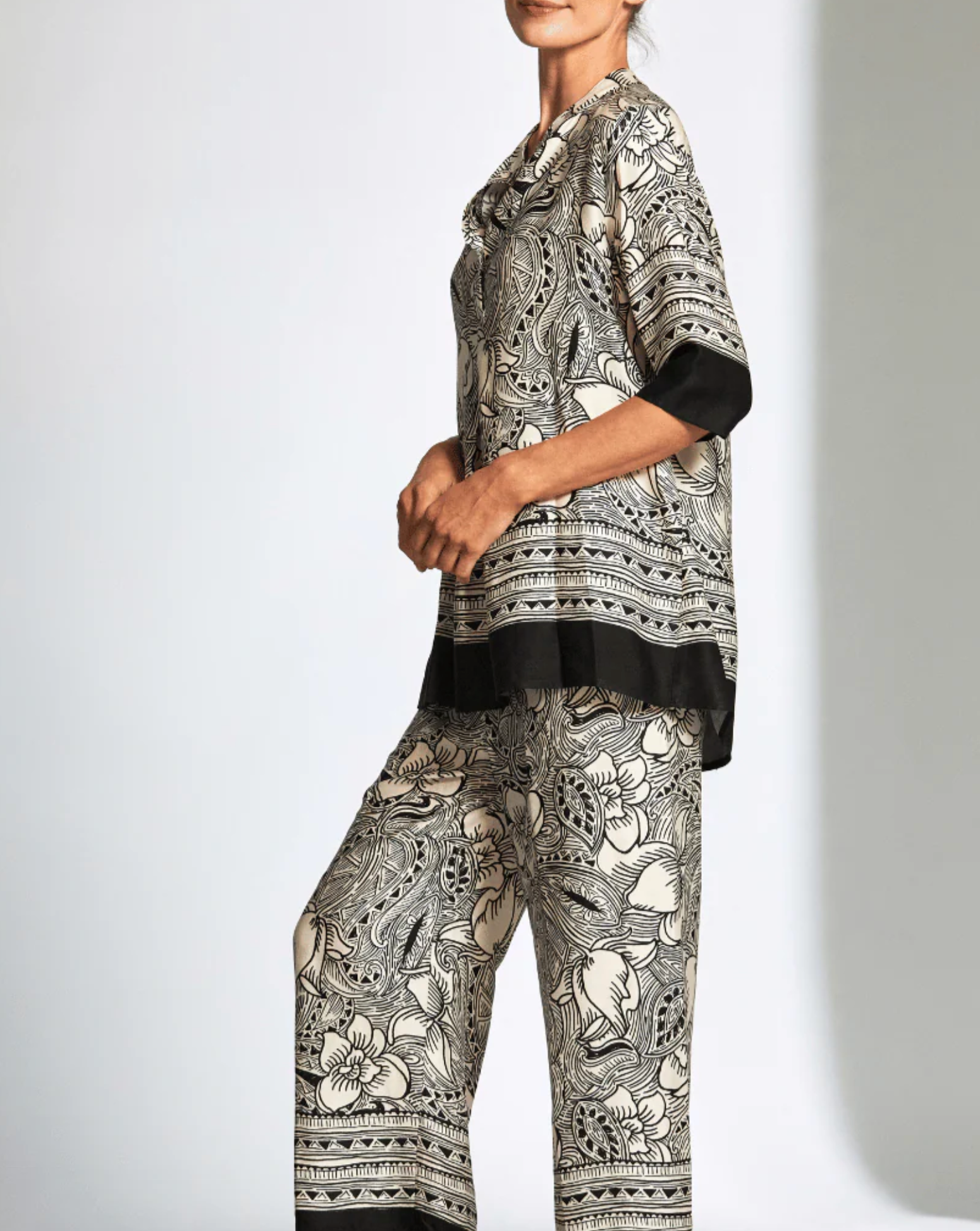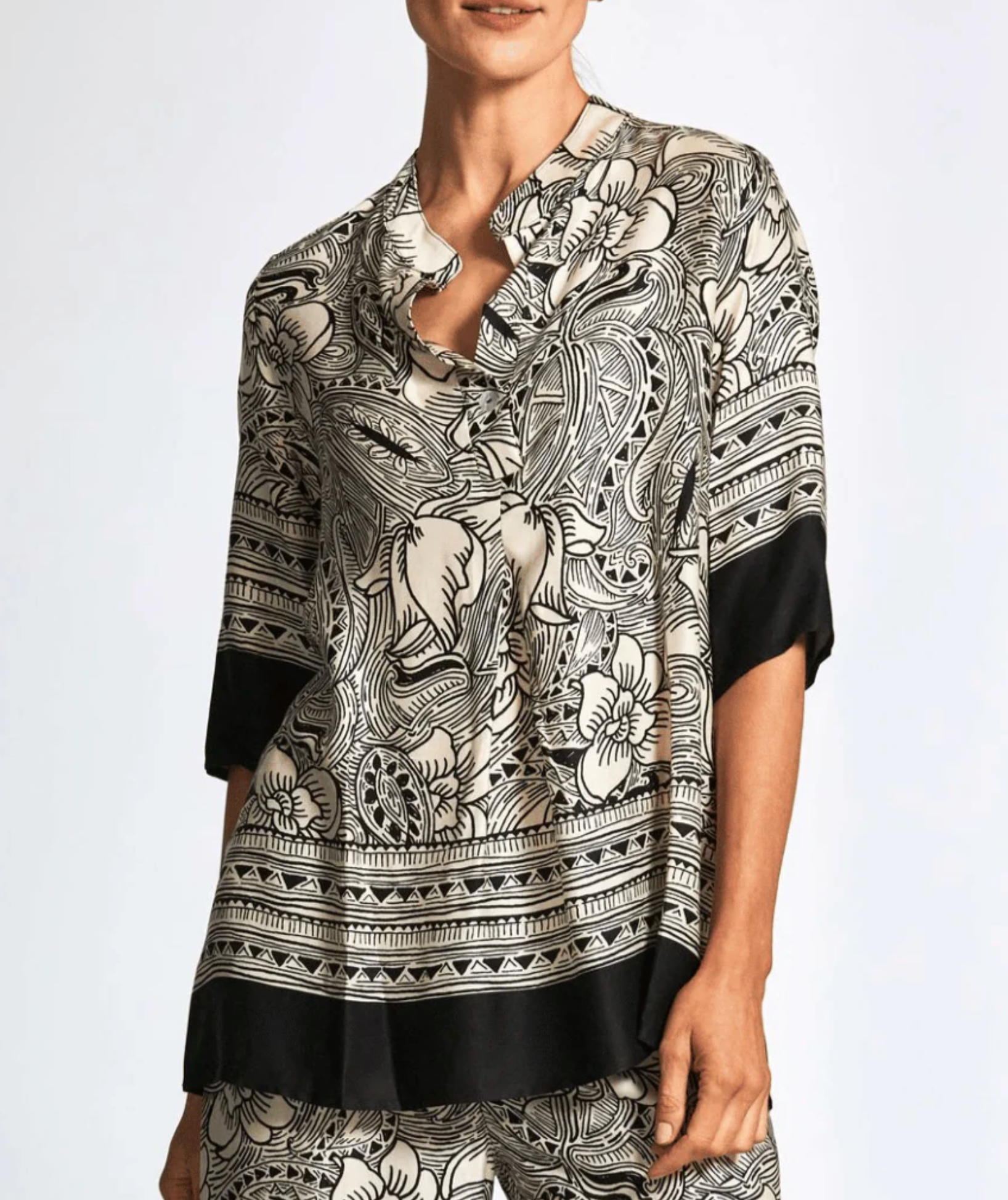 The Peruzzi Woodblock Print Top in Black and Ecru features: