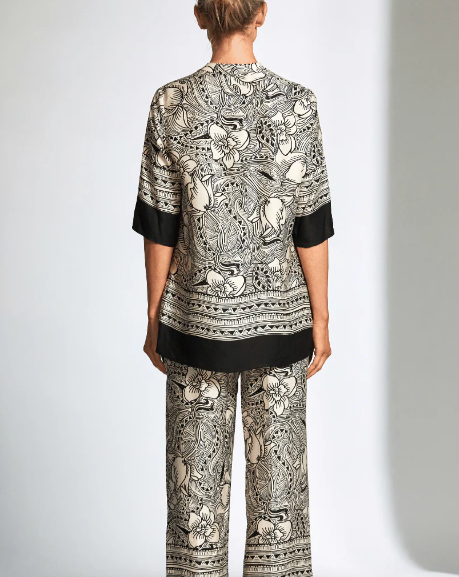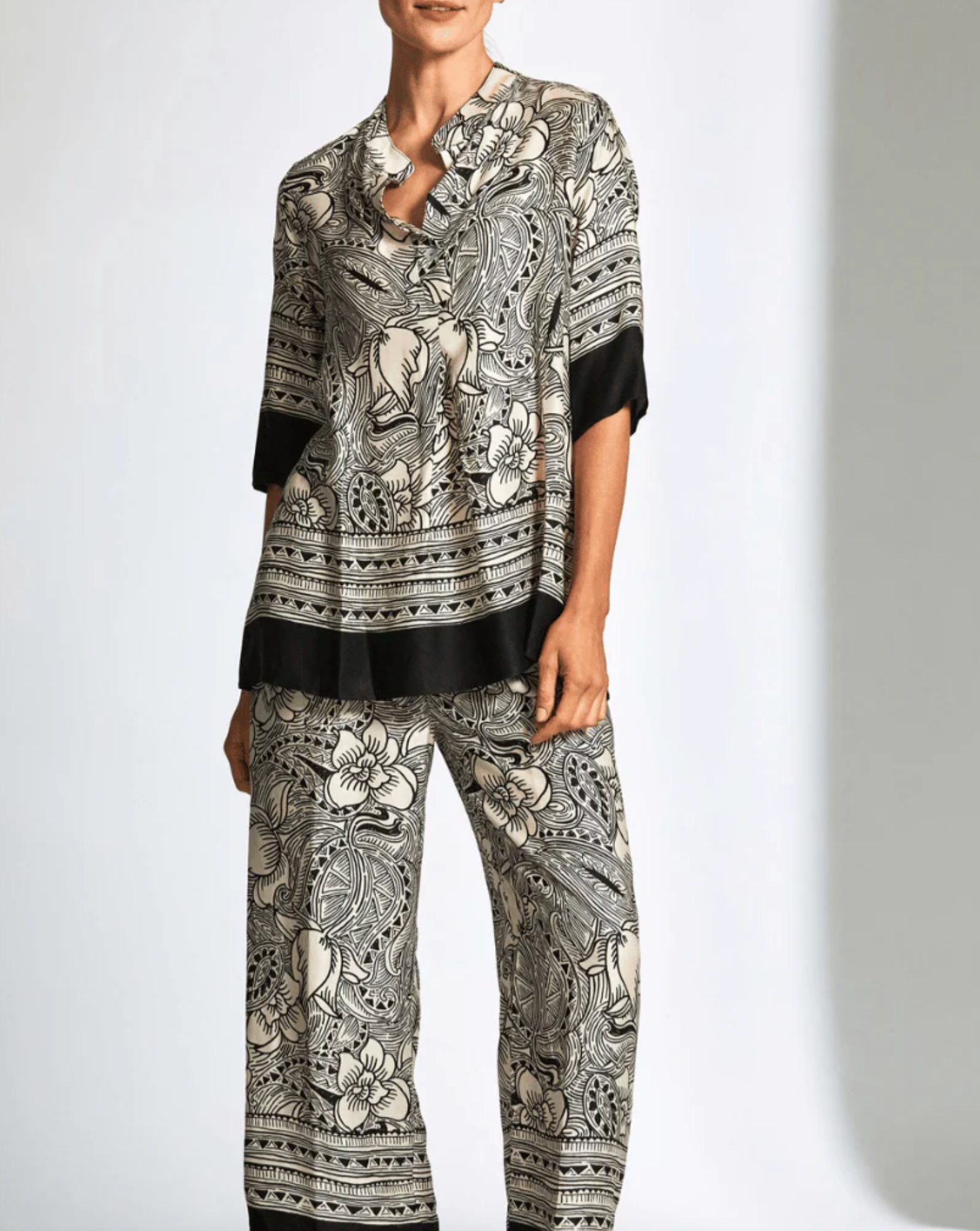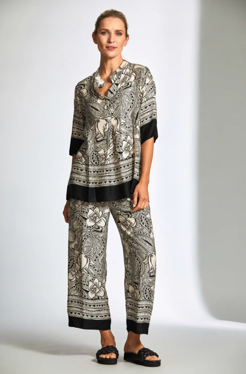 The Peruzzi Woodblock Print Trousers are the perfect choice for a relaxed yet sophisticated look. Crafted from high-quality, lightweight fabric with a stunning, unique print, they provide a comfortable fit with a flattering straight-leg cut, making them perfect for both casual and dressier occasions. Whether styled with a simple tee or tank for a chic daytime look or paired with the matching printed blouse for a polished evening ensemble, these trousers are a versatile wardrobe staple.