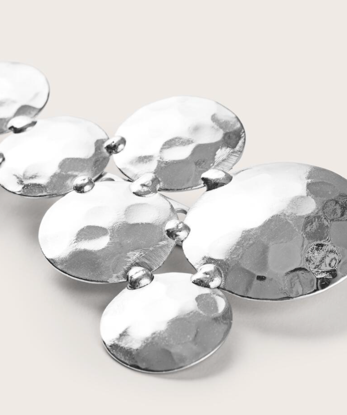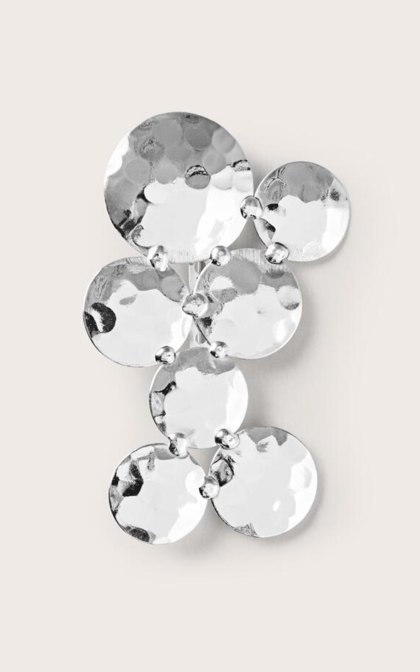 Add a cool edge to your look with this metal brooch. It's composed of hammered circles, creating a lively and feminine aesthetic. It stands beautifully on its own, but you can also complete this look with the matching earrings or bangle for an exclusive ensemble.