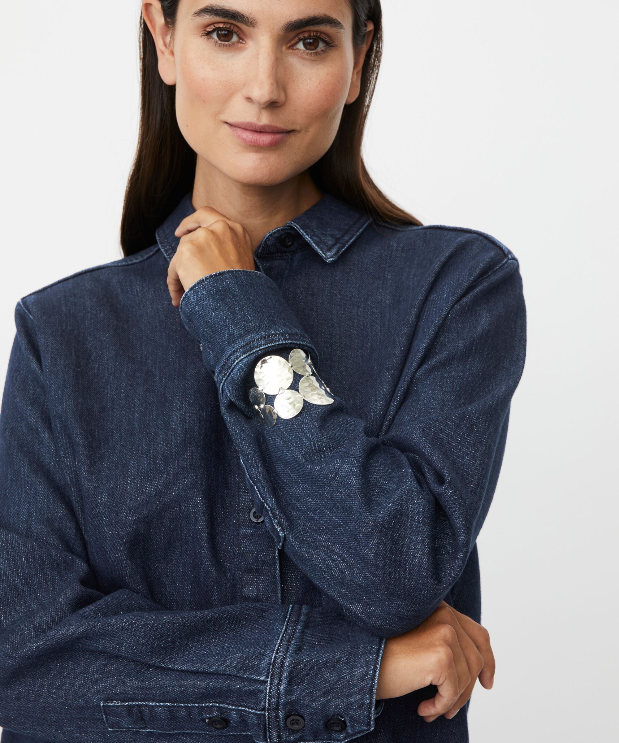 Add a cool edge to your look with this metal bracelet. It's composed of hammered circles, creating a lively and feminine aesthetic. The bracelet can be easily adjusted so you can wear it just how you like - higher up on the arm or outside a blouse for an impactful look. It stands beautifully on its own, but you can also complete this look with the matching earrings or brooch for an exclusive ensemble.