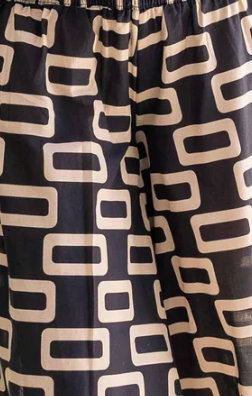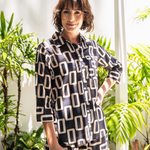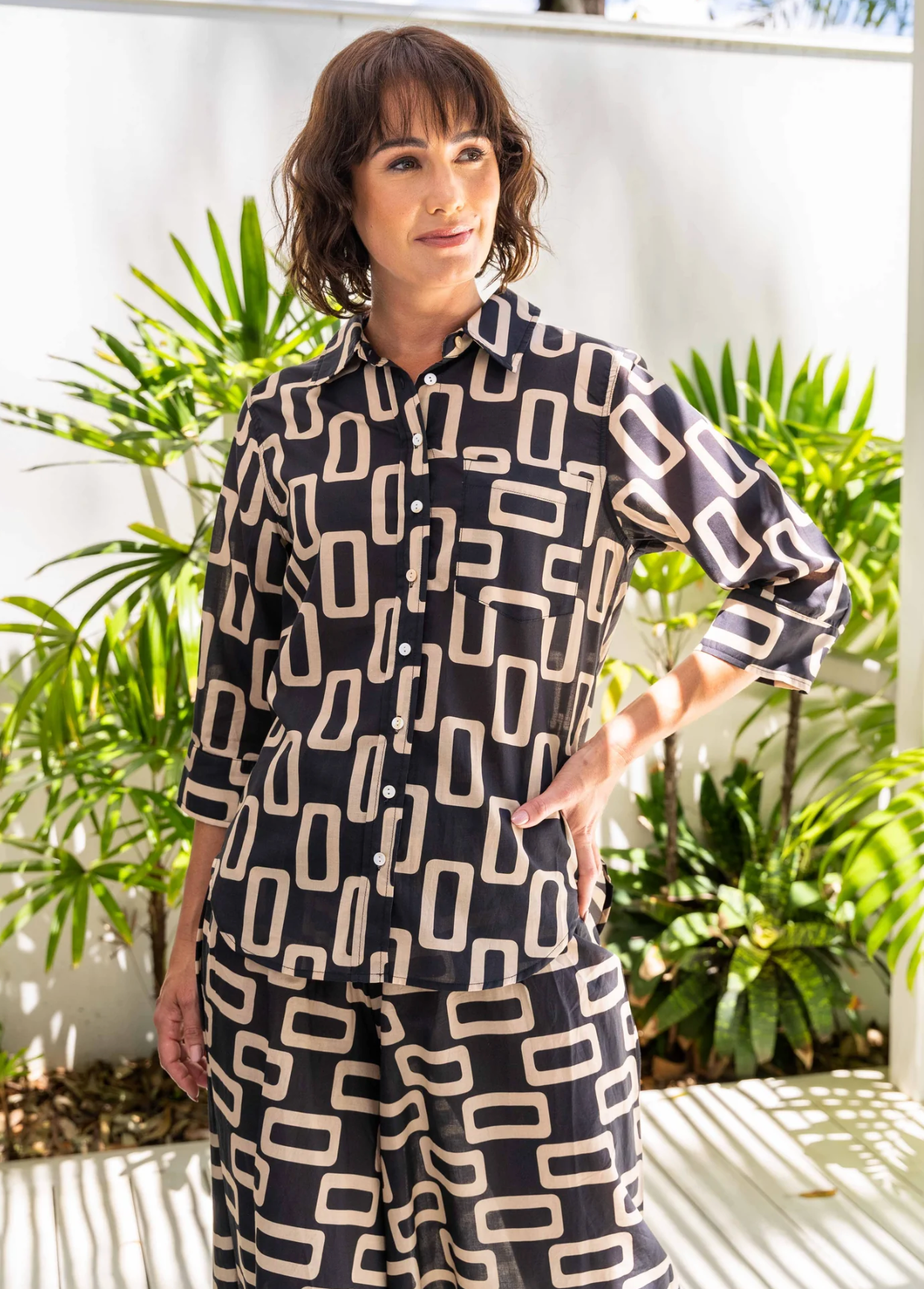 Make a bold statement in the See Saw 3/4 Sleeve Shirt featuring a playful abstract geometric print in black and natural tones. Lightweight and breathable, this relaxed button-up brings effortless charm to everyday wear, whether styled with the matching pants or dressed down with crisp linen.