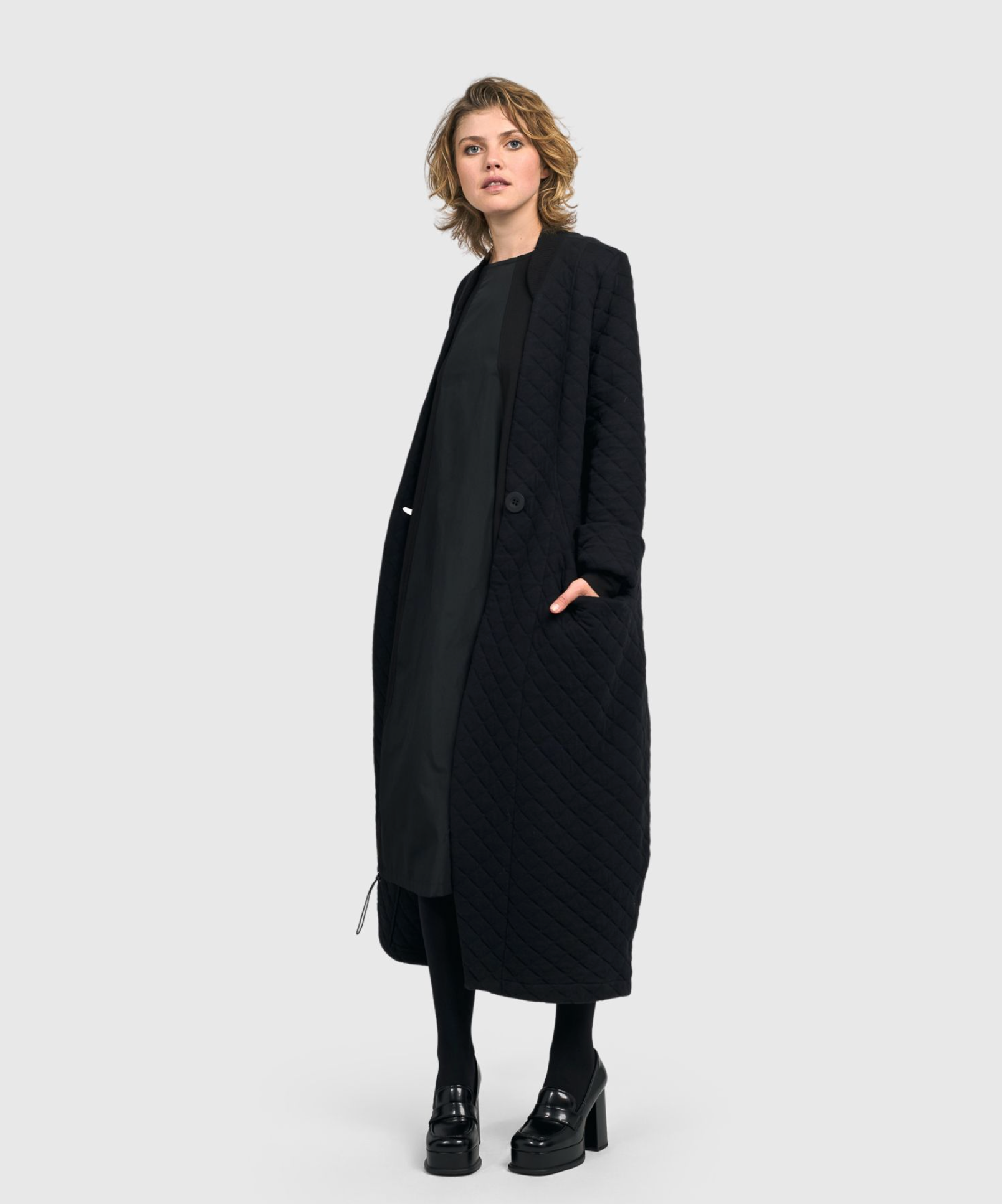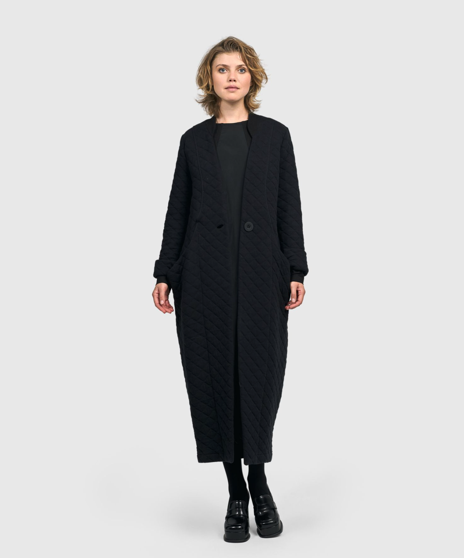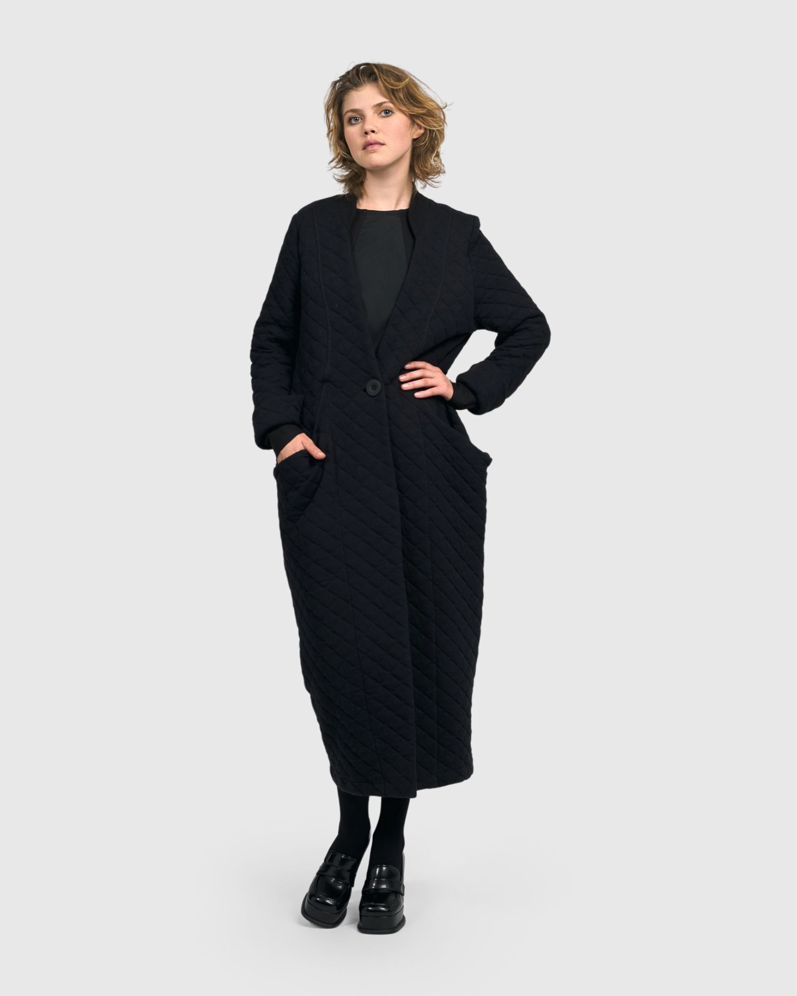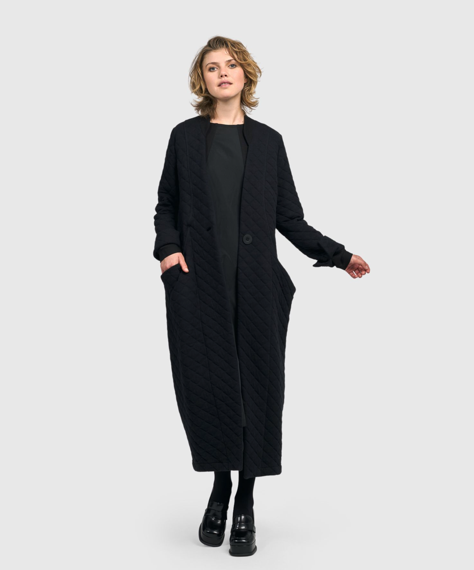 This long knit coat is made in a mid weight quilted knit and has a pristine tailored shape with deep front pockets, a big front button and long cuffed sleeves. An elegant choice for anywhere from a formal event to throwing on for a quick outing.