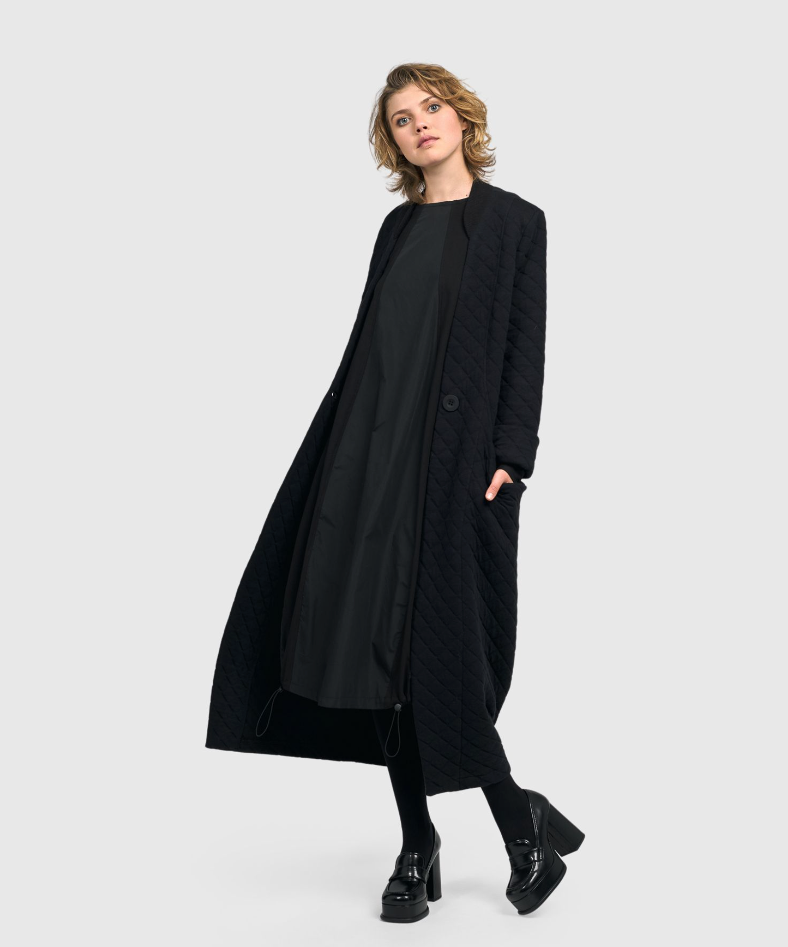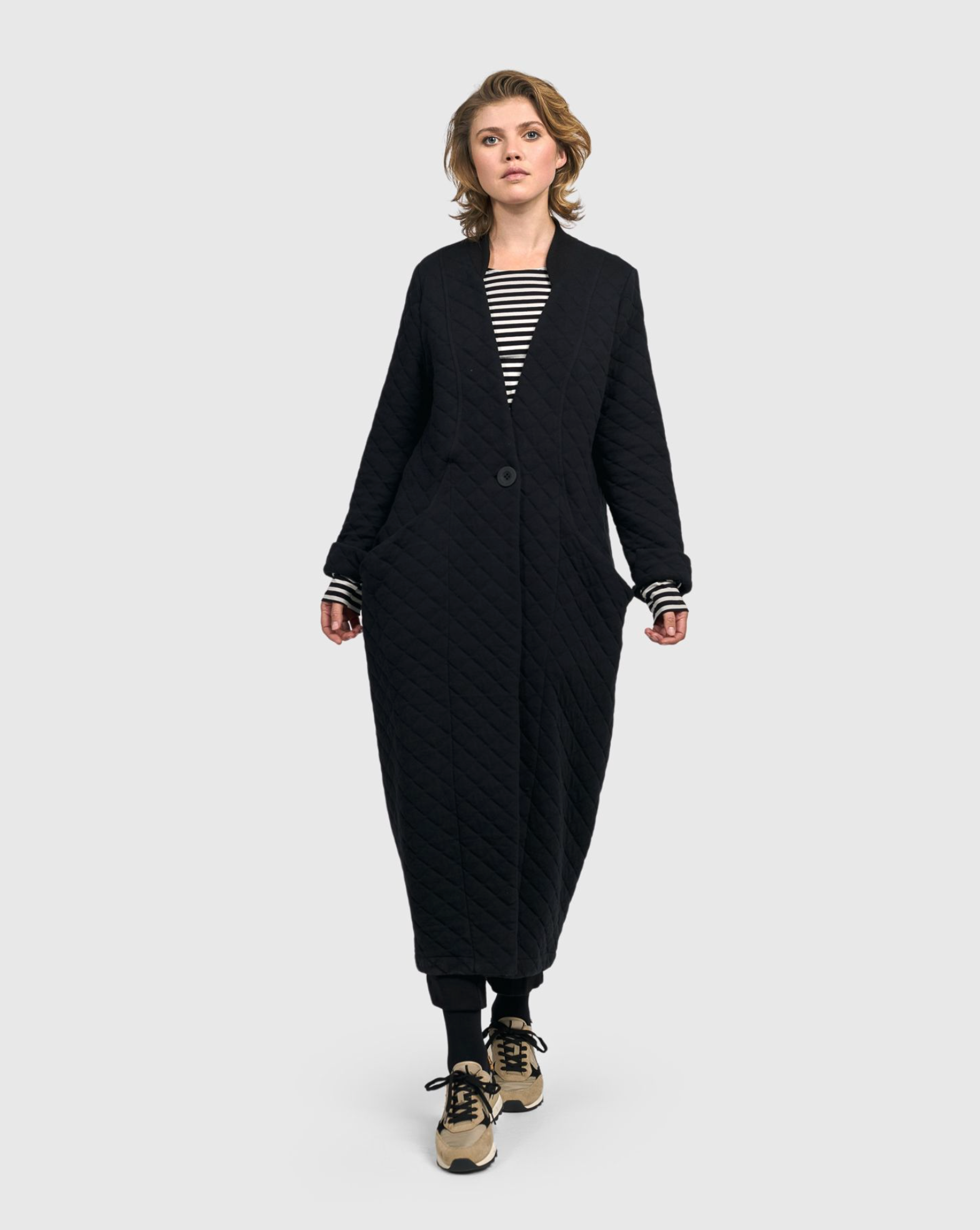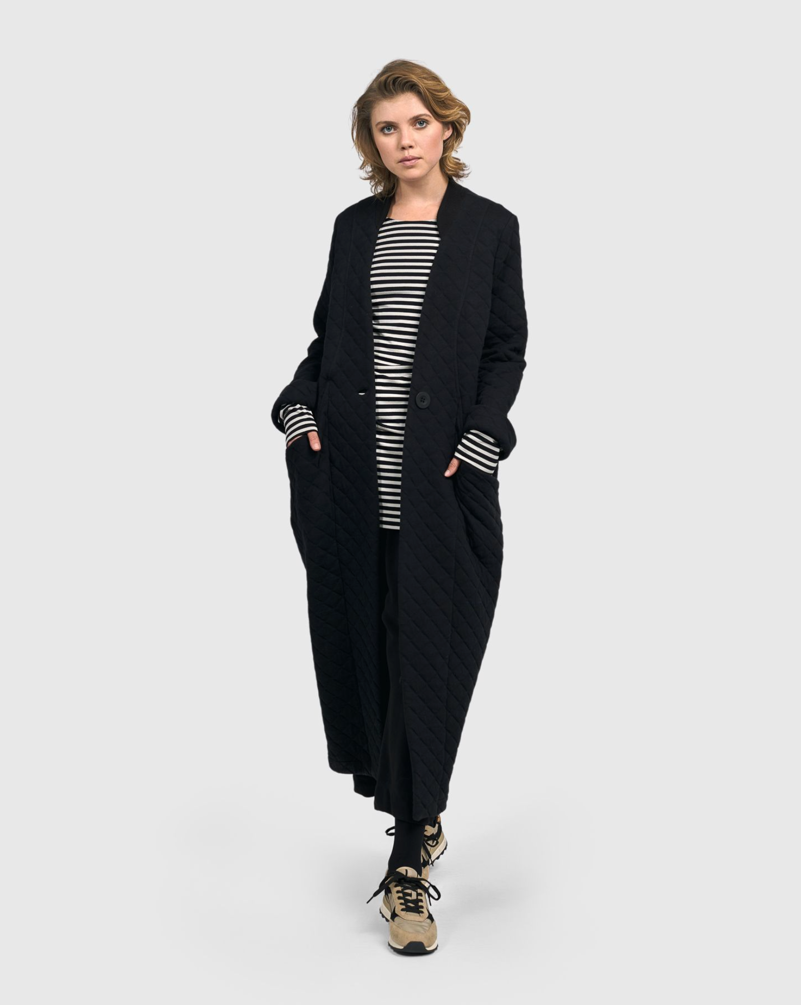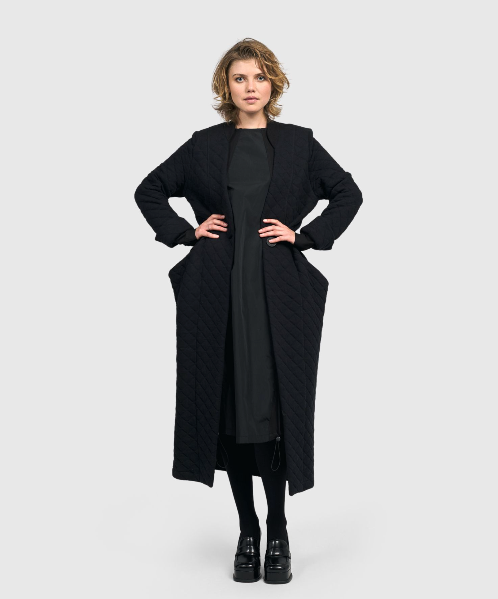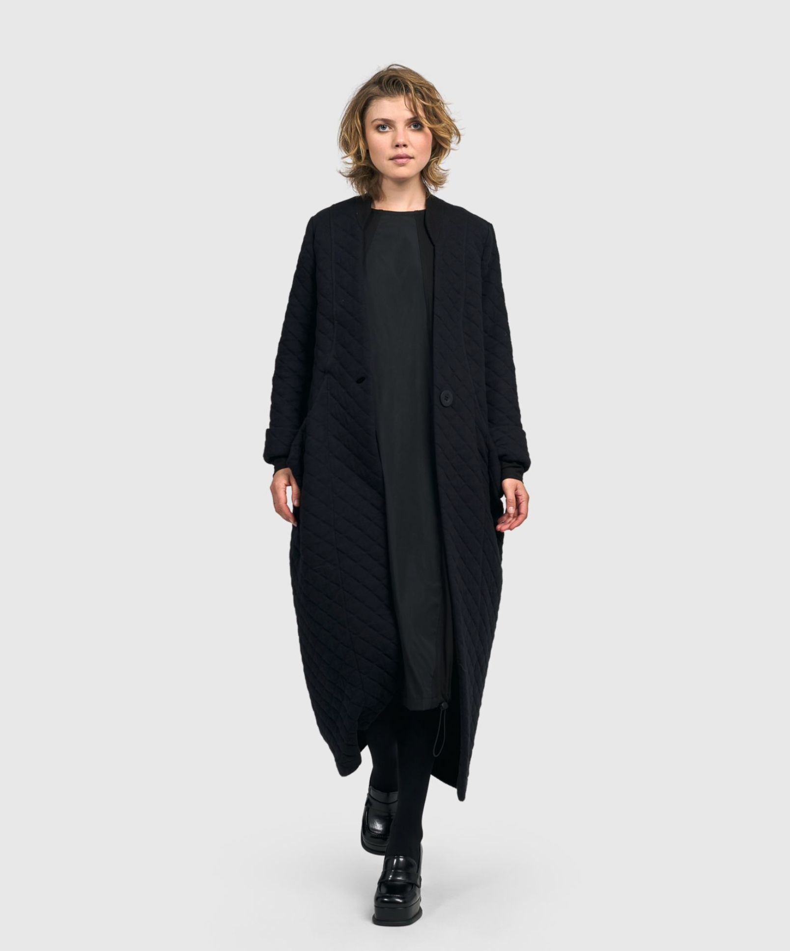 This long knit coat is made in a mid weight quilted knit and has a pristine tailored shape with deep front pockets, a big front button and long cuffed sleeves. An elegant choice for anywhere from a formal event to throwing on for a quick outing.