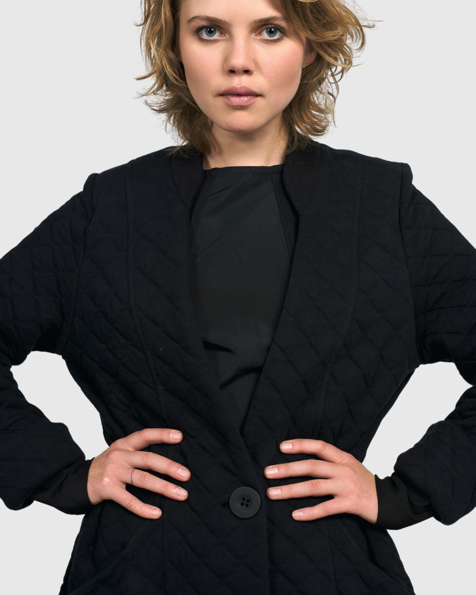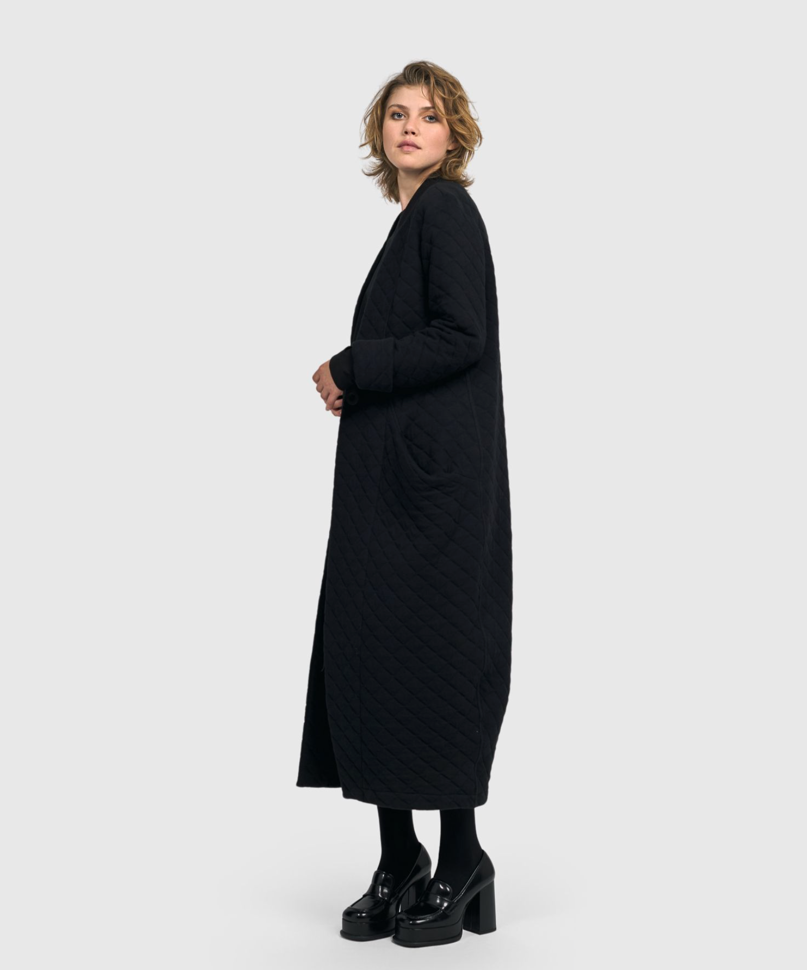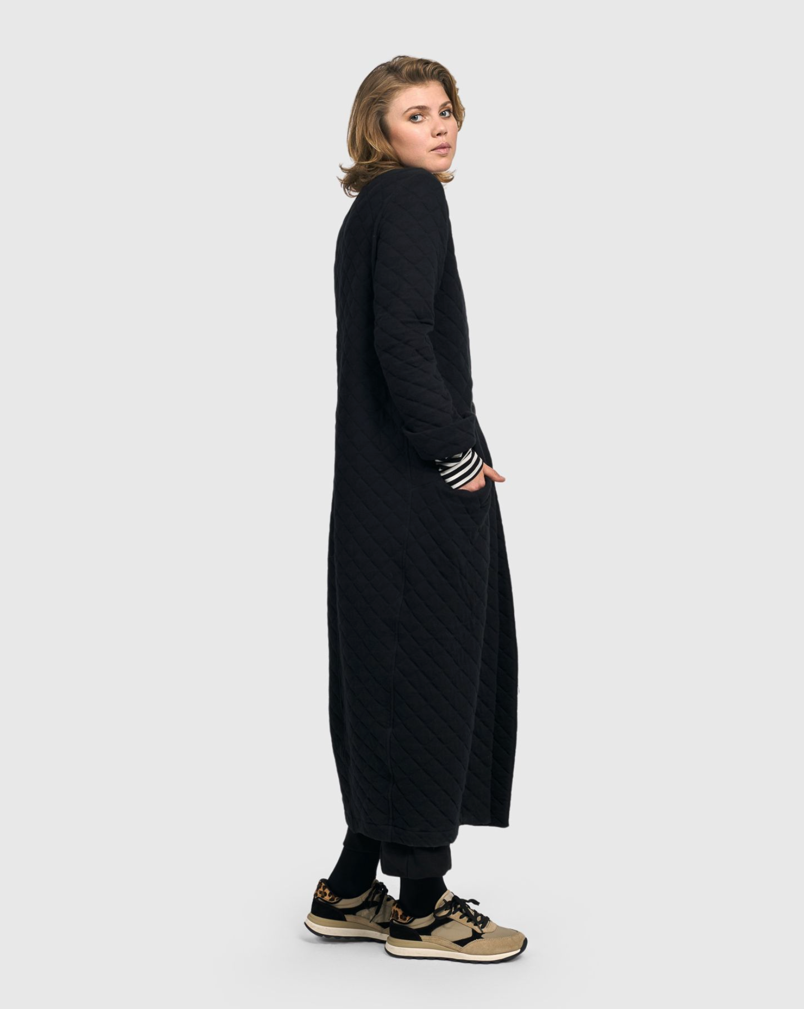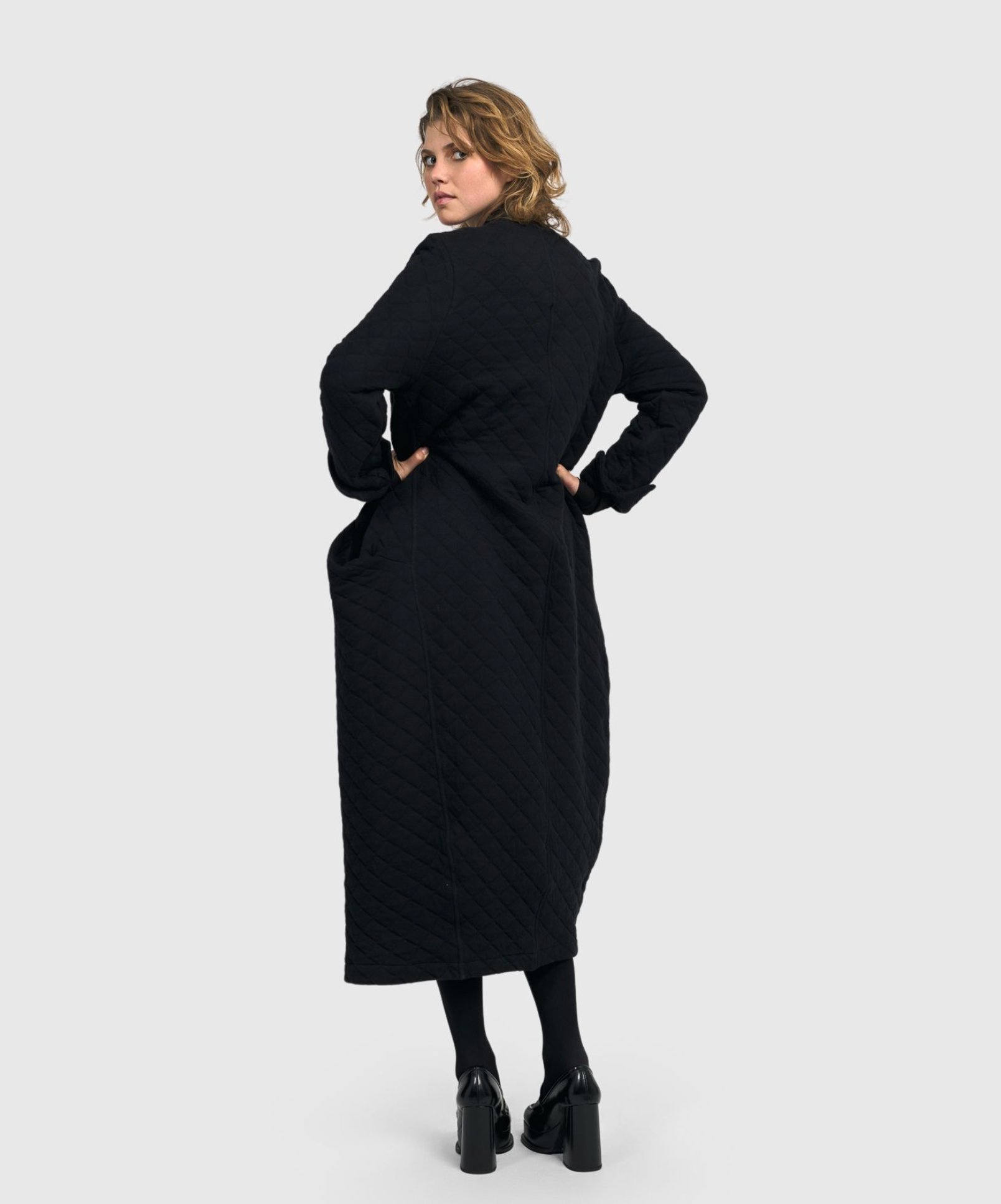This long knit coat is made in a mid weight quilted knit and has a pristine tailored shape with deep front pockets, a big front button and long cuffed sleeves. An elegant choice for anywhere from a formal event to throwing on for a quick outing.