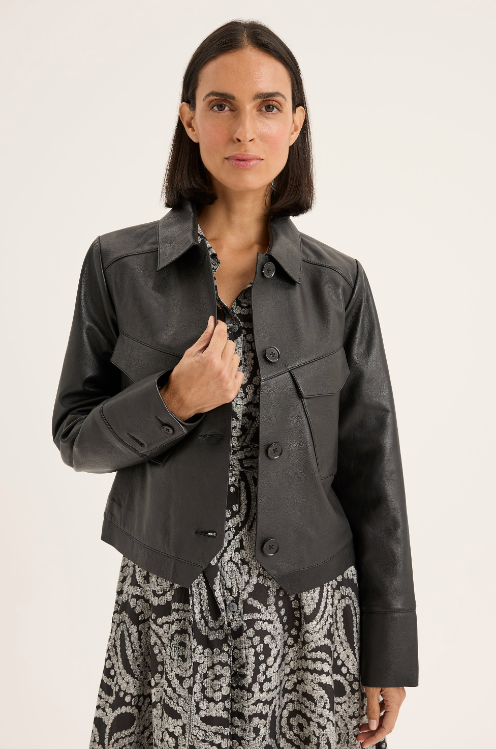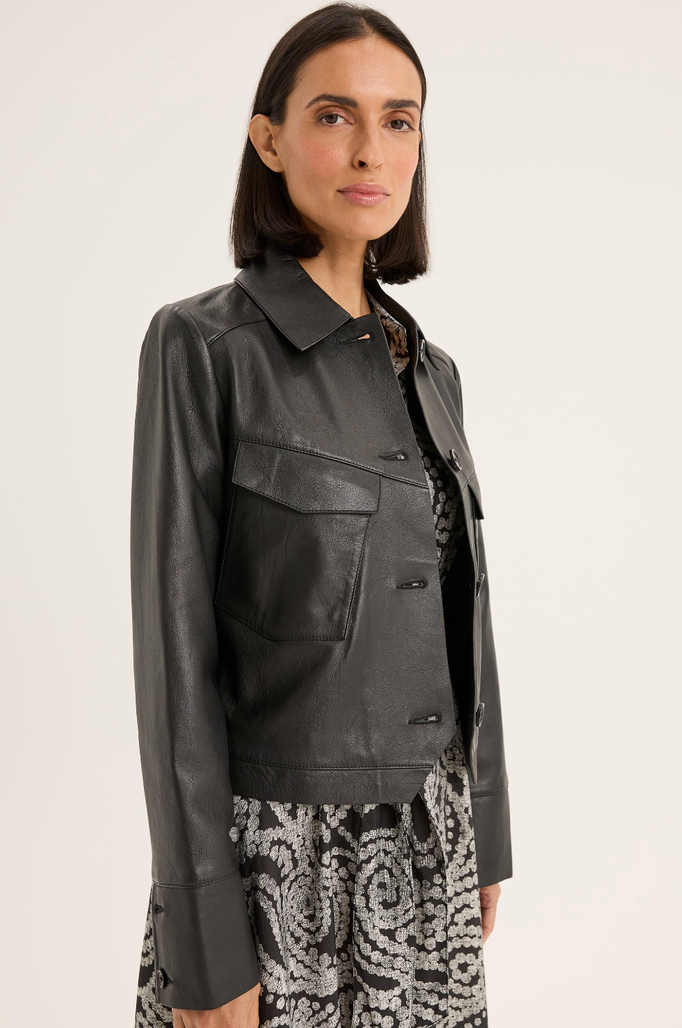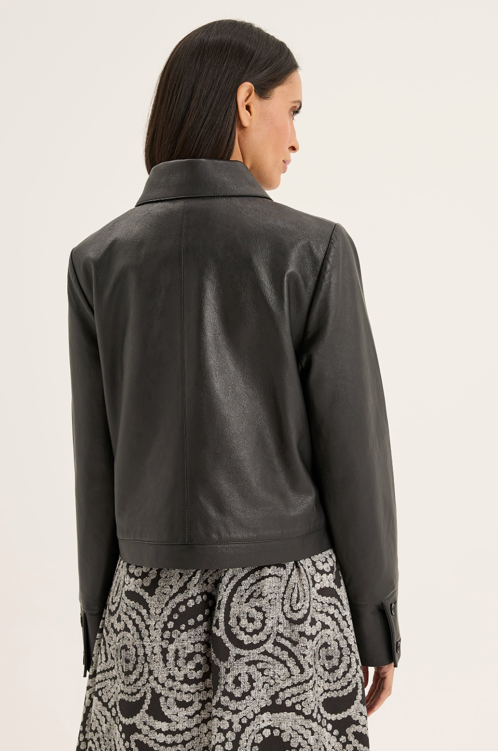 The Raw Hide Jacket is an eye-catching piece to any ensemble. Crafted from 100% leather with its soft and smooth texture, this piece is a perfect blend of luxury and sophistication. A falling just below the waistline, it has a contemporary touch while adding meticulous detailing with sealed edges . The jacket is fully lined offering extra comfort while featuring convertible collar, long sleeves and buttons front for practicality. Complete the look with our Raw Hide Skirt or Pant for a dressy and fashion-forward look, or pair with a white tee and denim for a chic casual vibe.