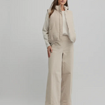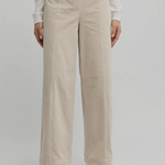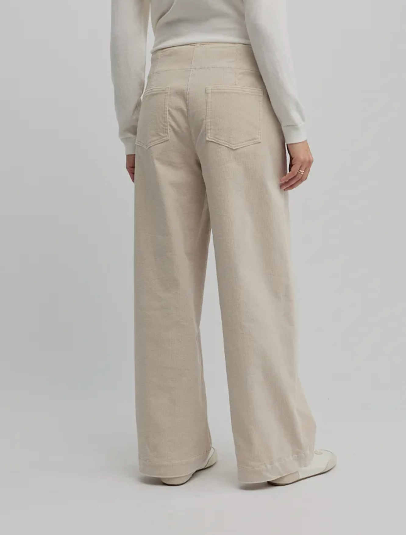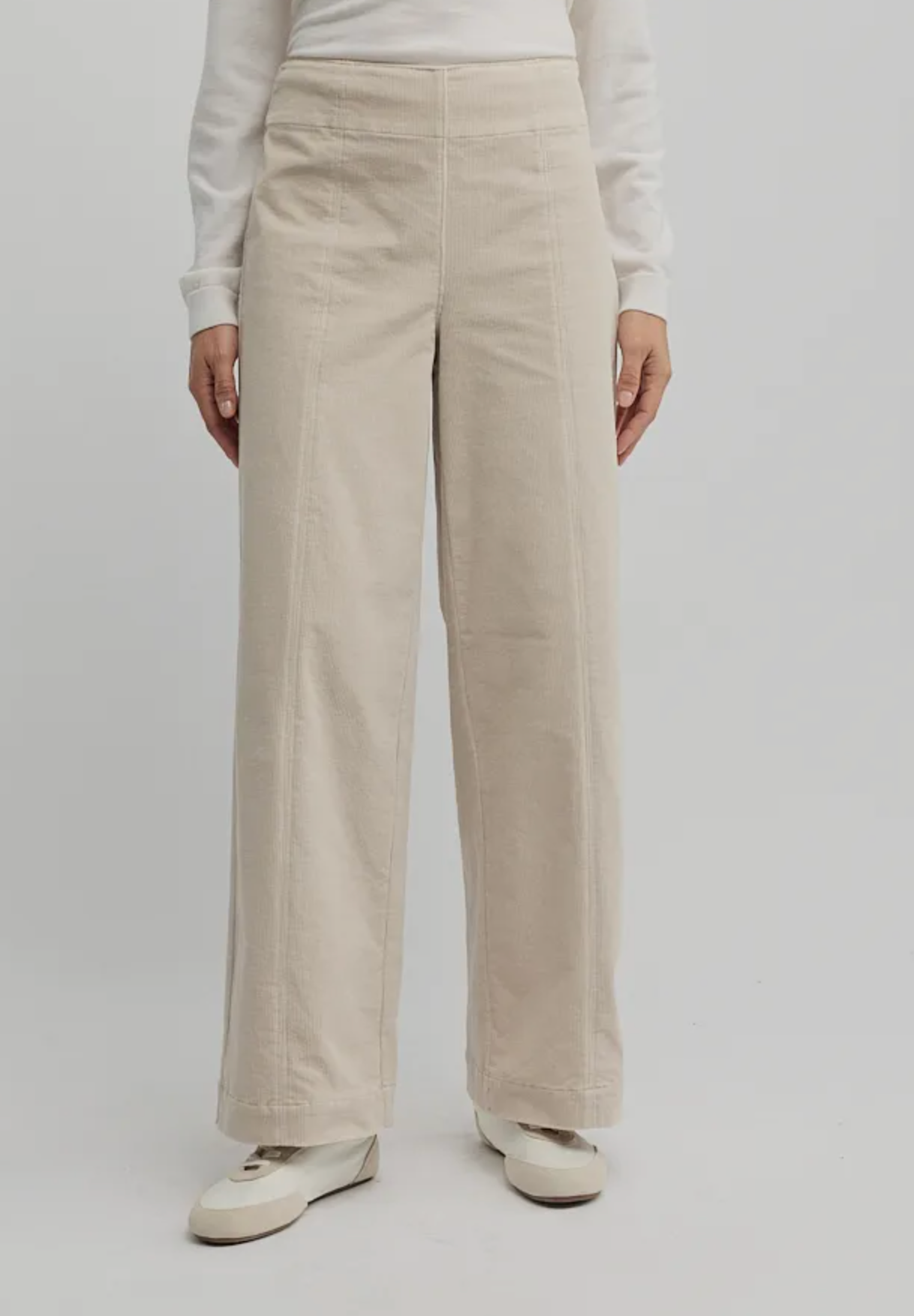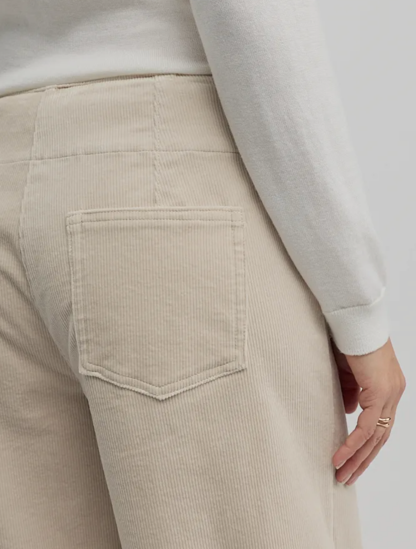Crafted from a soft cotton elastane blend with a gentle corduroy texture, the Woods Wide Leg Pant offers comfort with a relaxed, easy drape. Designed in a full-length wide leg silhouette with a clean grown-on waistband, it features patch pockets and an invisible side zip for a smooth finish. Style it with the matching the Levity Puffer for a coordinated look, or pair with knitwear for effortless everyday wear.